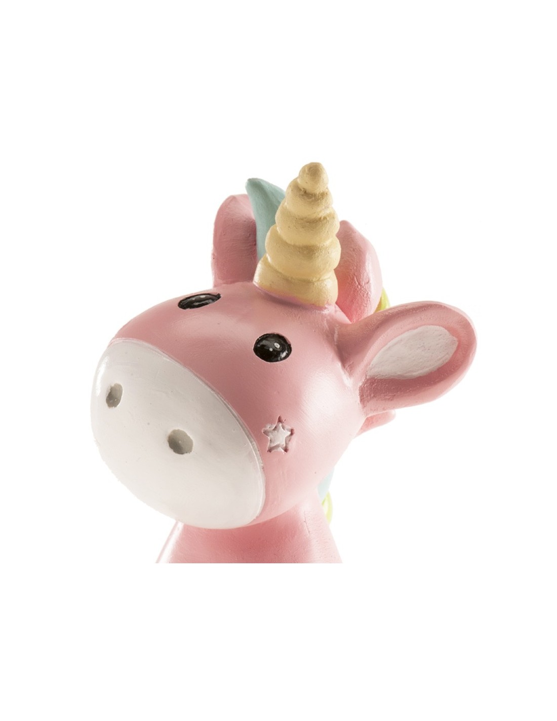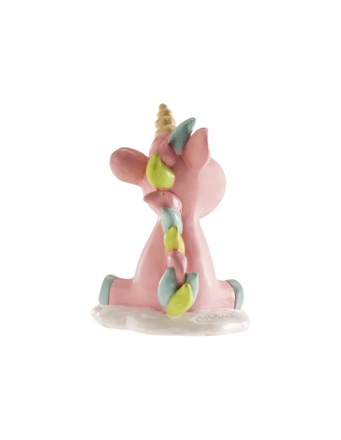 Bonita figura de unicornio rosa de Dekora. Ideal para poner sobre la tarta de la bautizo y después poder conservarla.