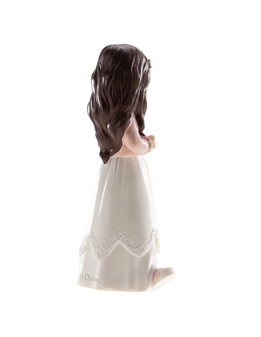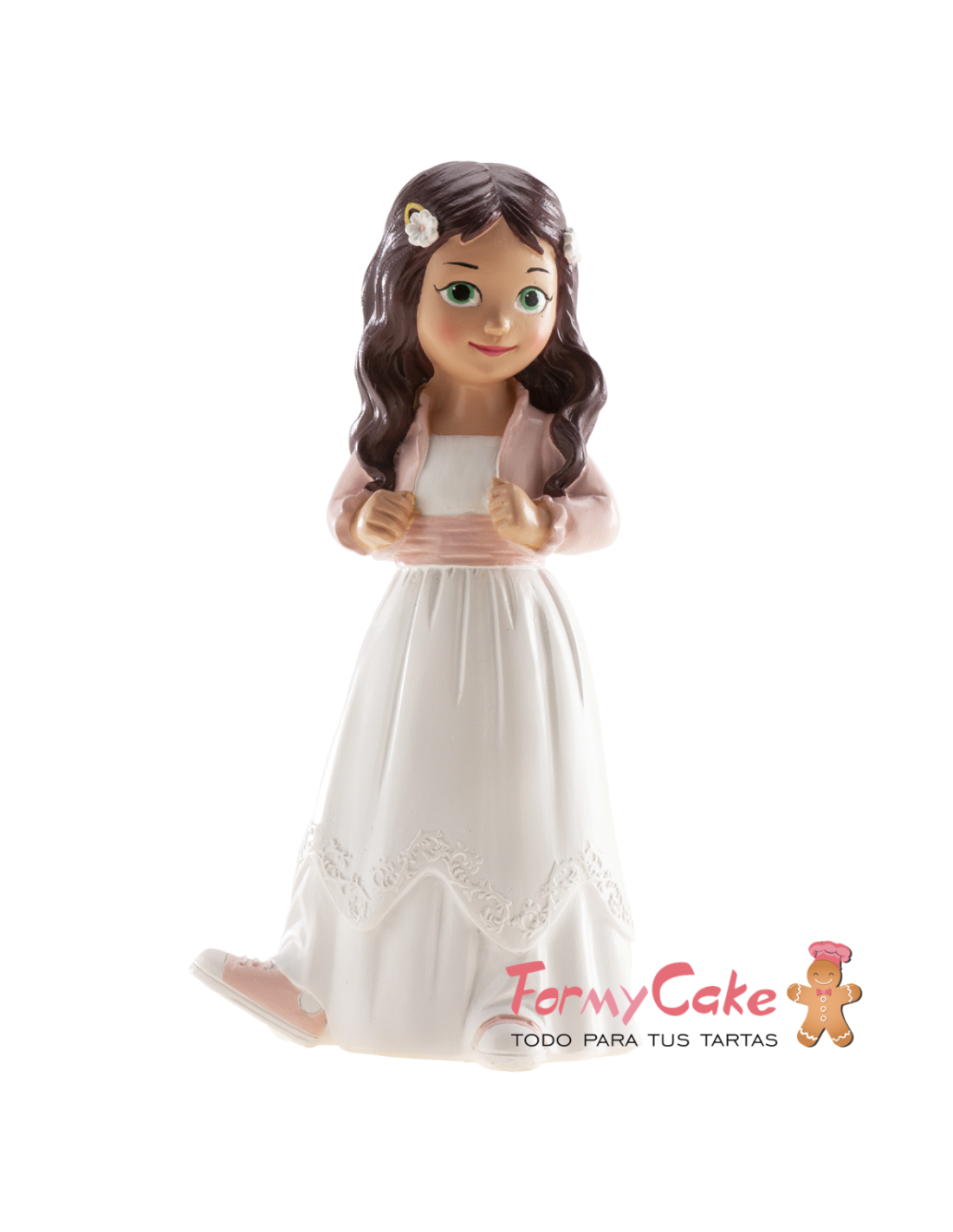 Bonita figura de niña con un bonito vestido blanco, florecita en el pelo y fajín rosa a juego con la chaquetita y las zapatillas. Ideal para poner sobre la tarta de la comunión y después poder conservarla.