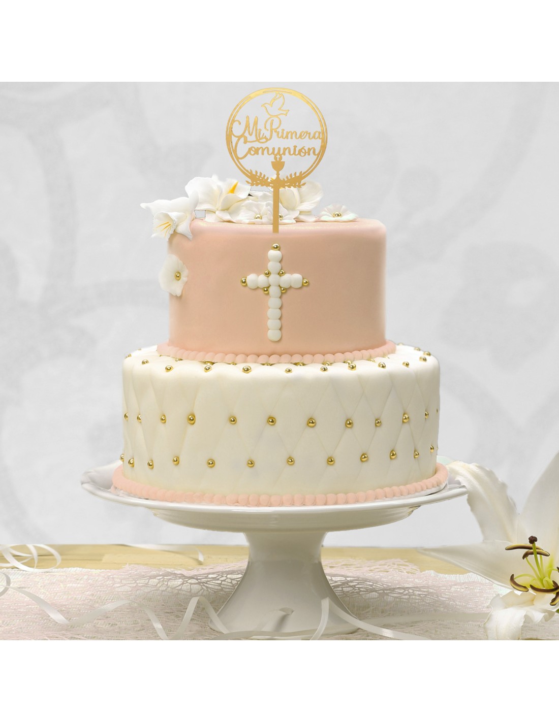 Da un toque elegante con este Topper de Mi Primera comunión. De color dorado Suave.
