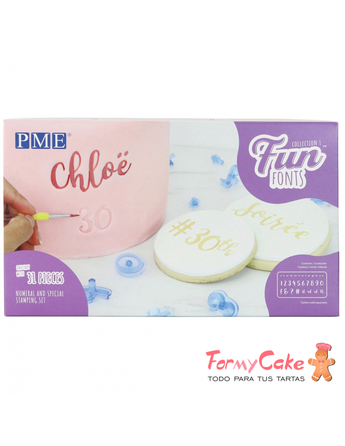 Este set con números, caracteres especiales y acentos complementa la colección 1 de Letras de PME. Los sellos están hechos de plástico transparente de color azul pálido con una línea central que sirve de ayuda para colocar las letras. Y, por supuesto, es perfecto para añadir un mensaje personal en tu tarta o cupcakes.