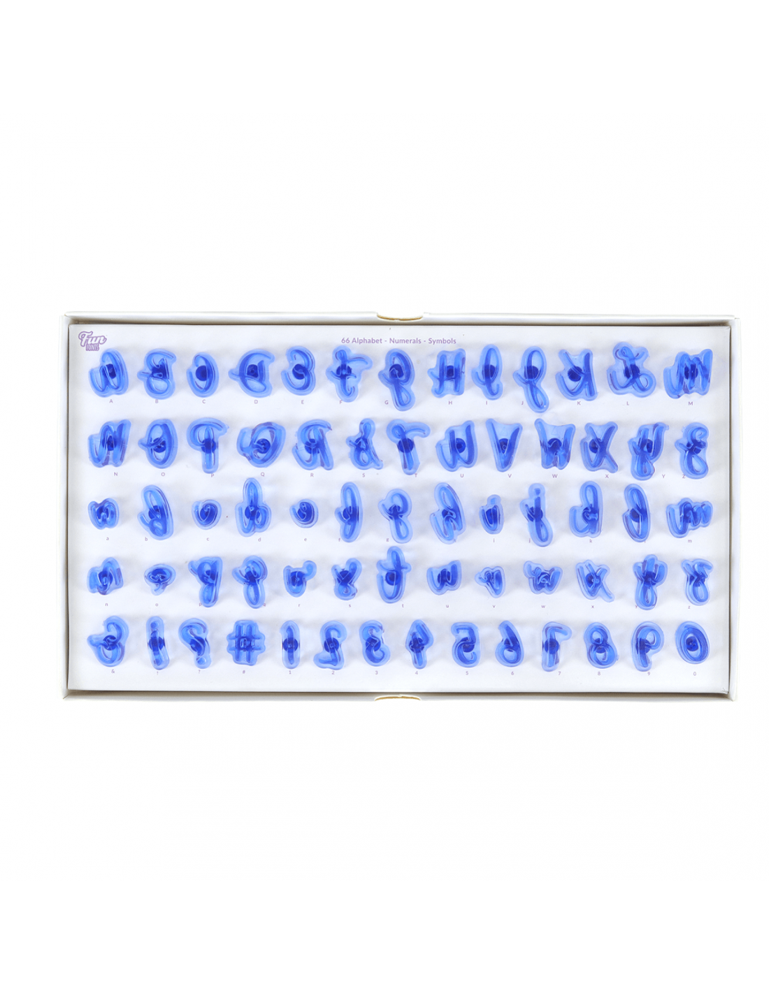 Conjunto completo de 66 piezas incluyendo 26 mayúsculas, 26 minúsculas, número 0 - 9 y símbolos &, !, ? y #.
