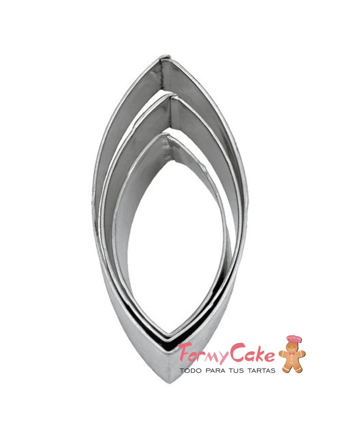 Cortador con forma de ovalo en tres medidas diferentes de acero inoxidable de la marca Stadter . Ideal para repostería y dar forma a galletas, mazapán y fondant y otros artículos.