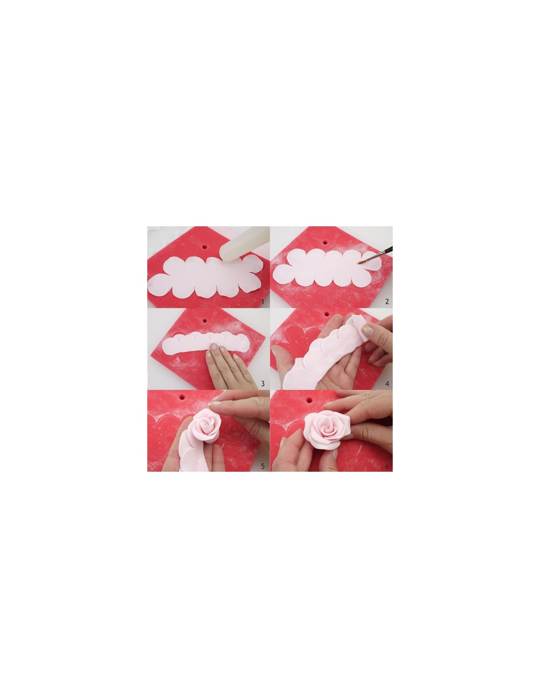 Corta el fondant y utiliza la parte posterior de un rodillo para suavizar los bordes. Cubre una mitad con pegamento comestible y pégala con la otra. Coloca en tu mano la pieza de fondant y dobla con cuidado las hojas. Para hacer rosas más pequeñas, corta en piezas más pequeñas y utiliza el mismo método que con la rosa grande.