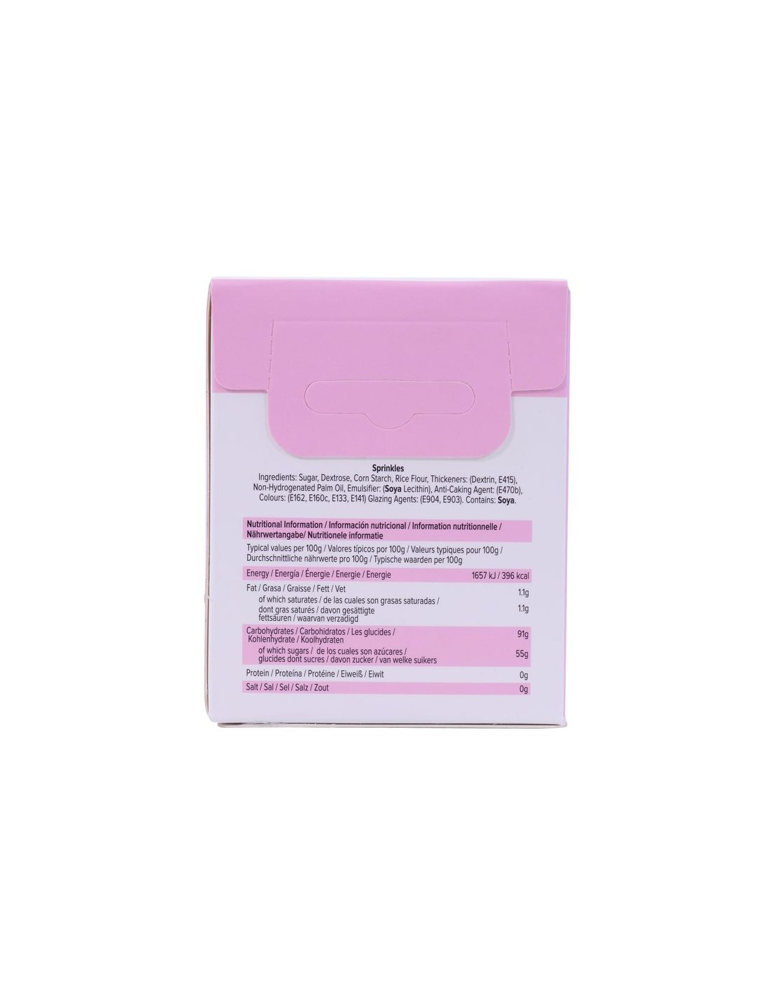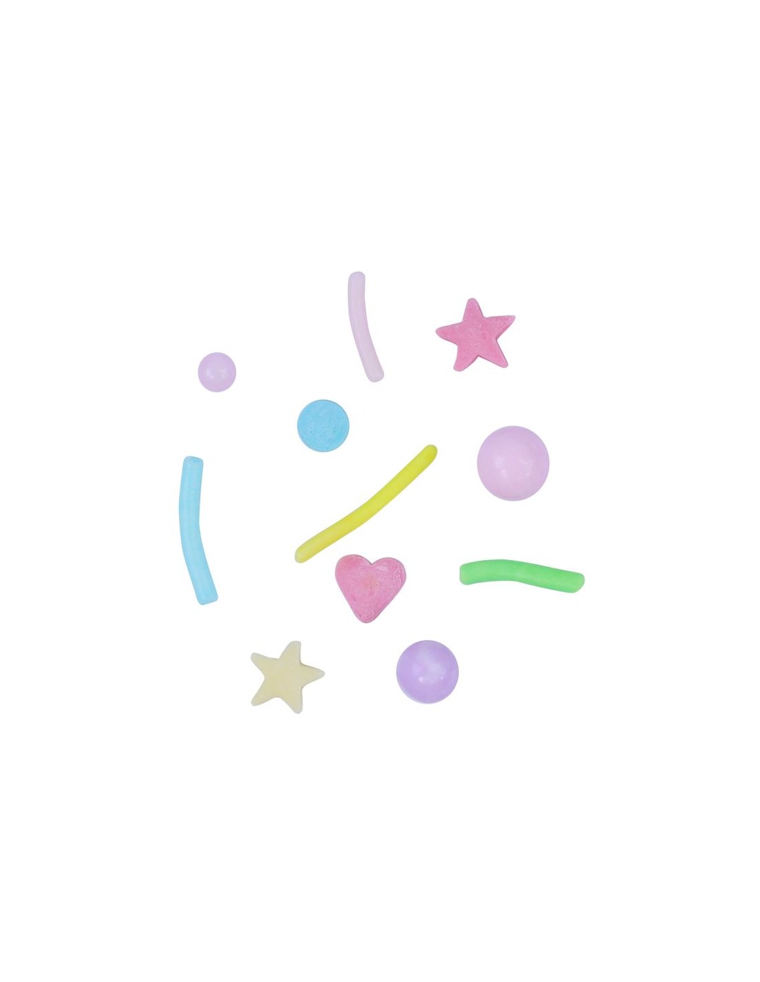 Ingredientes: azúcar, dextrosa, almidón (maíz), harina de arroz, dextrina, aceite vegetal no hidrogenado (palma), goma xantana, emulgente: E572, colorante: E160c, E141, E162, E133, glaseado, agente de glaseado: E903 .