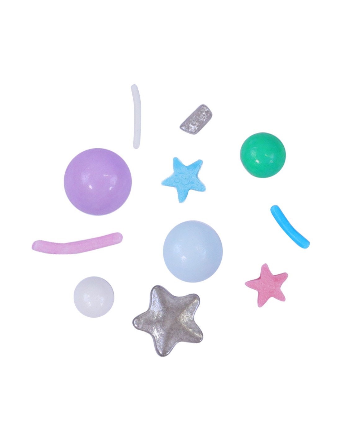 Ingredientes: azúcar, dextrosa, almidón (maíz), harina de arroz, dextrina, aceite vegetal no hidrogenado (palma), goma xantana, emulgente: E572, colorante: E162, E160c, E133, E153, E141, E100, E174, glaseado, agente de glaseado: E903, E904 .