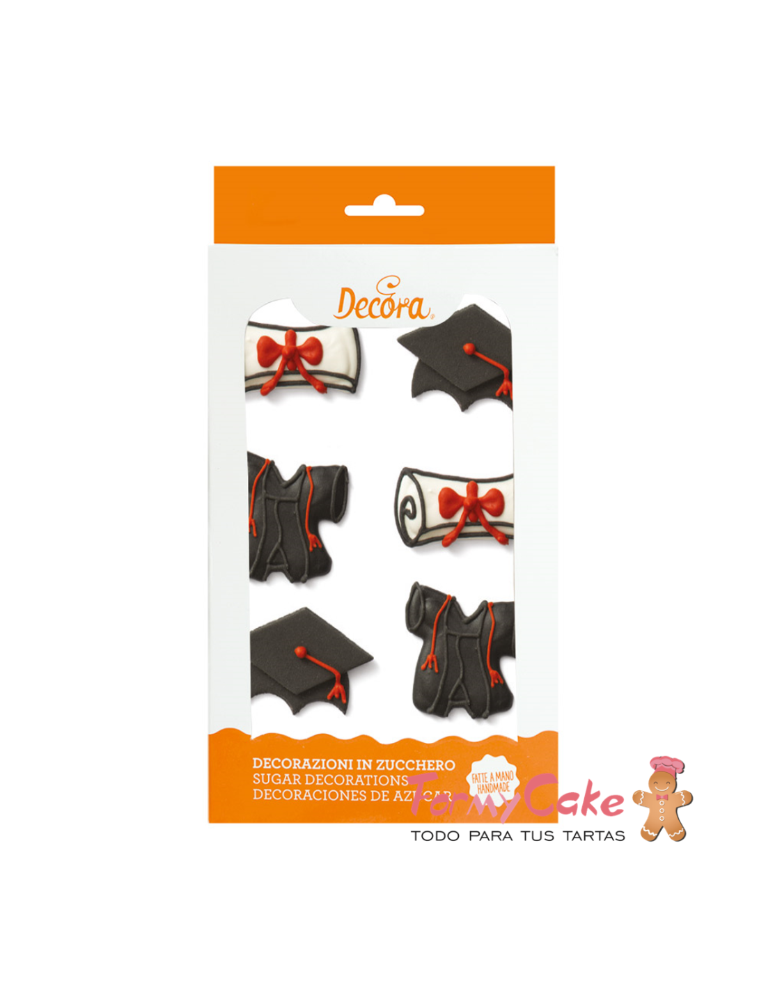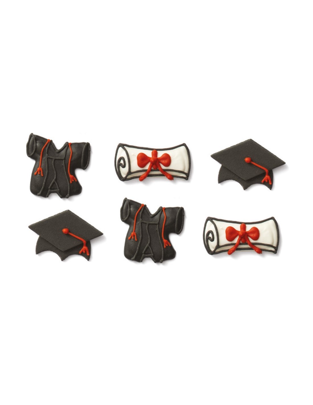 Decoraciones de azúcar, listas para usar. Hecho a mano con tintes de extracción natural. Perfecto para decorar fácilmente pasteles, cupcakes, galletas y golosinas. Pack de 6 piezas surtidas: birrete, diploma, y toga.