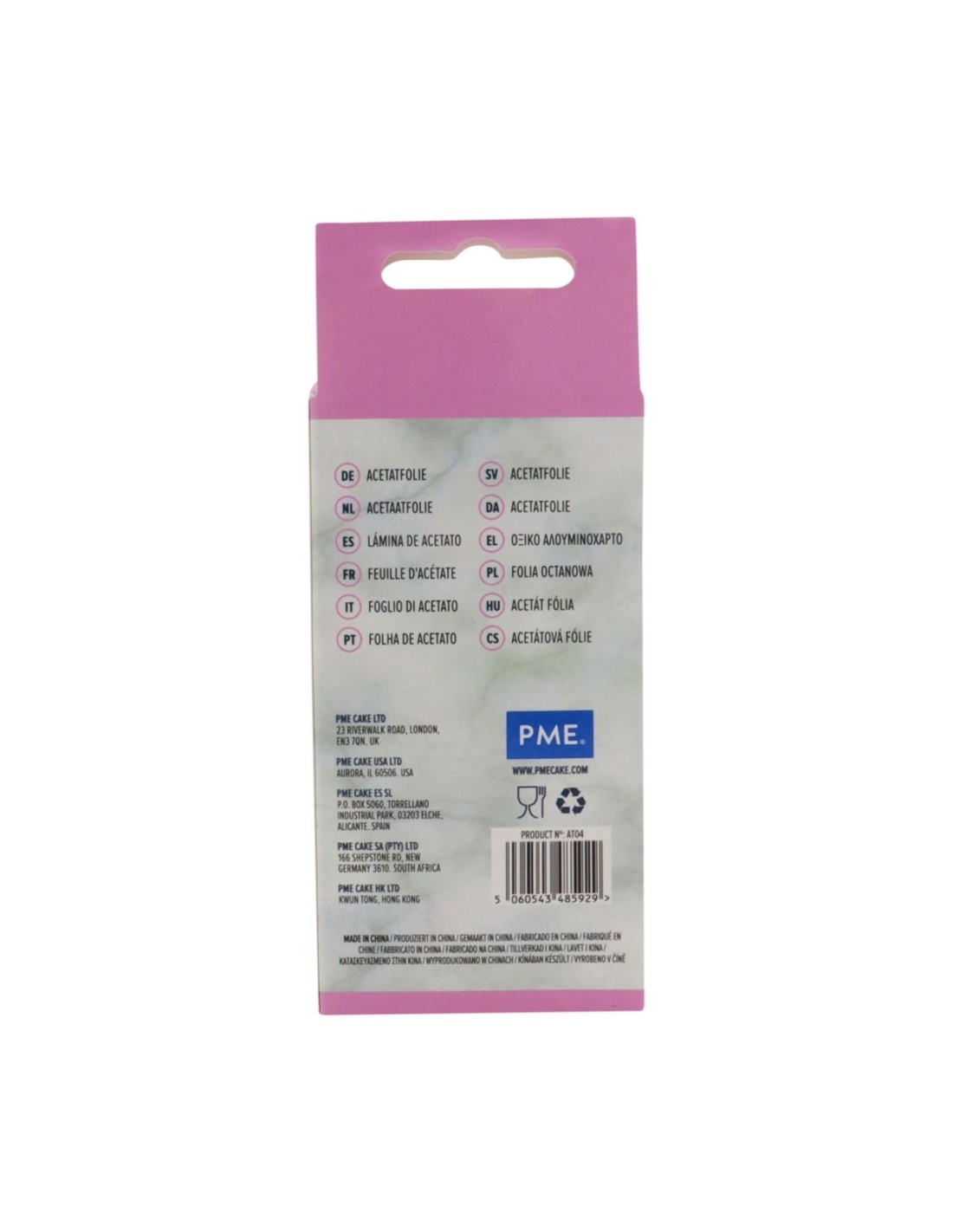 El rollo de acetato de PME es una lámina apta para alimentos. Con el acetato podemos trabajar con chocolate, conseguir un contorno perfecto en nuestras tartas de queso, ... es muy fácil de usar y manipular. Están con diferentes anchos para poder elegir aquel que se adapte mejor a tus necesidades.