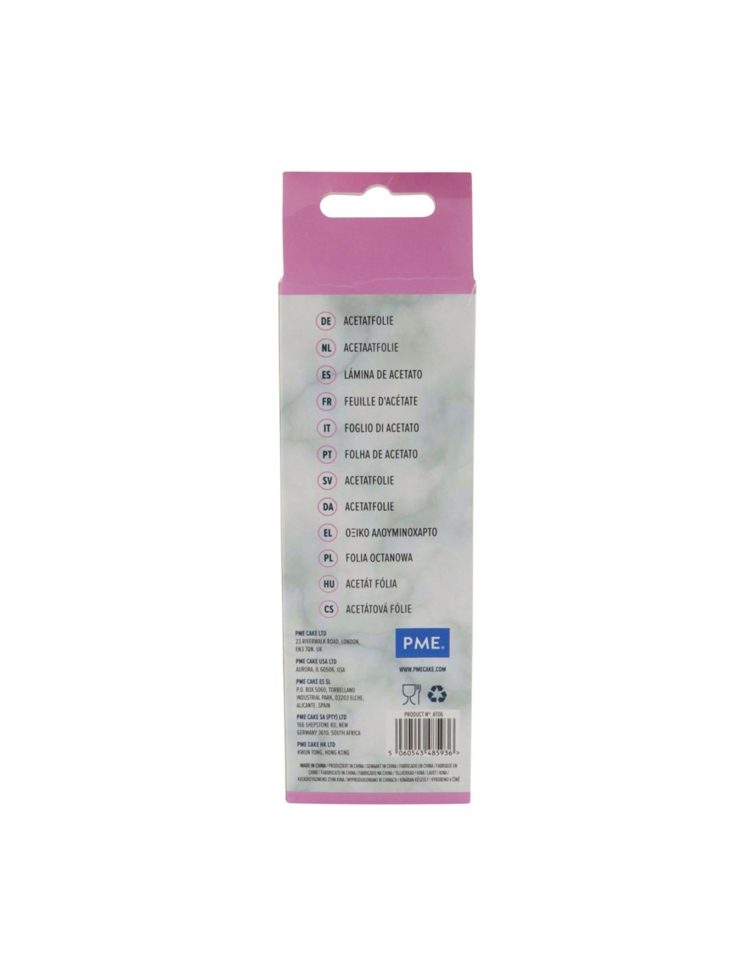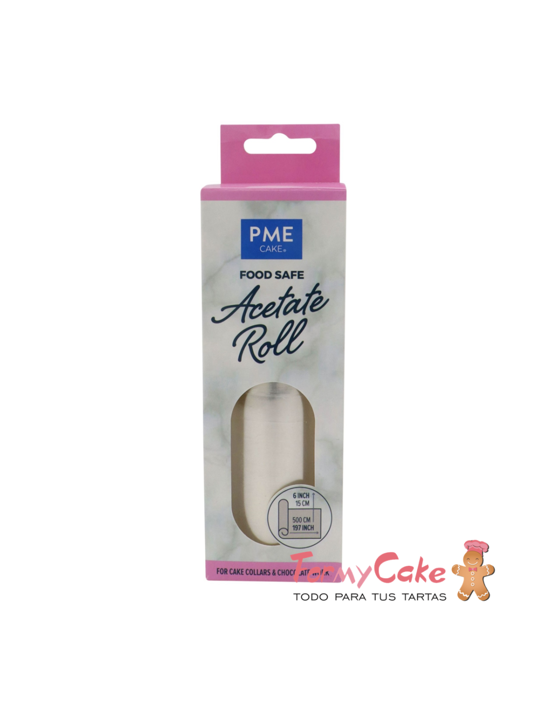 El rollo de acetato de PME es una lámina apta para alimentos. Con el acetato podemos trabajar con chocolate, conseguir un contorno perfecto en nuestras tartas de queso, ... es muy fácil de usar y manipular. Están con diferentes anchos para poder elegir aquel que se adapte mejor a tus necesidades.