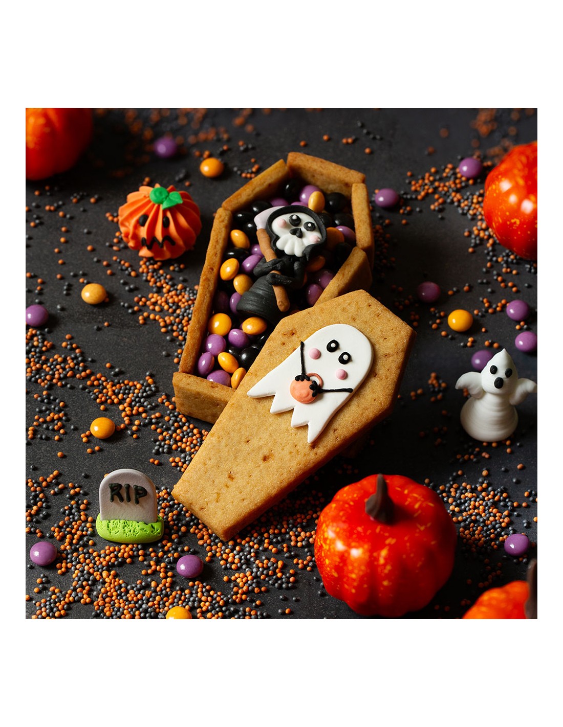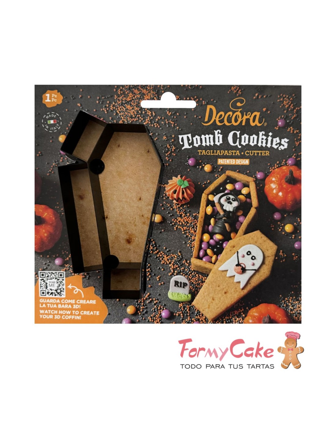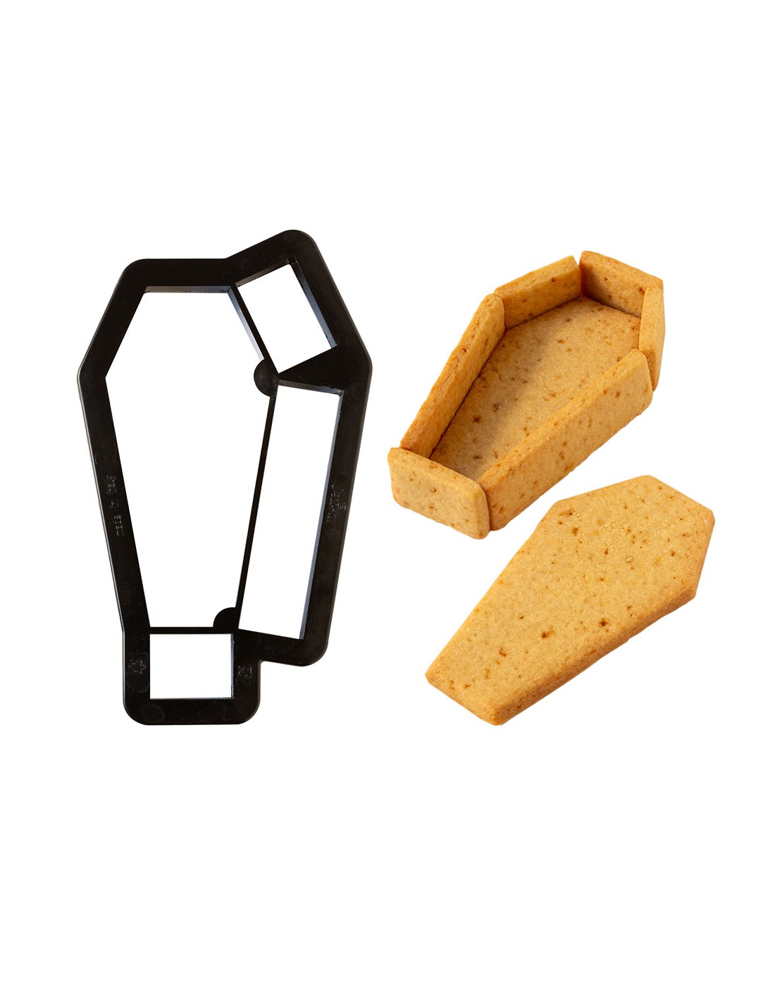 Haz un ataúd en 3D con dos sencillos pasos. ¡Este cortador proporciona todos los lados para armar un ataúd monstruoso y espeluznante! Cortar la masa dos veces, separar las formas obtenidas antes de cocinar la masa quebrada. Recomendamos congelar la masa quebrada durante unos minutos antes de separar las formas; De esta forma no correrás el riesgo de deformarlos. Montar las distintas piezas obtenidas: puedes utilizar glasa real como pegamento. Diviértete decorando tu ataúd en 3D.