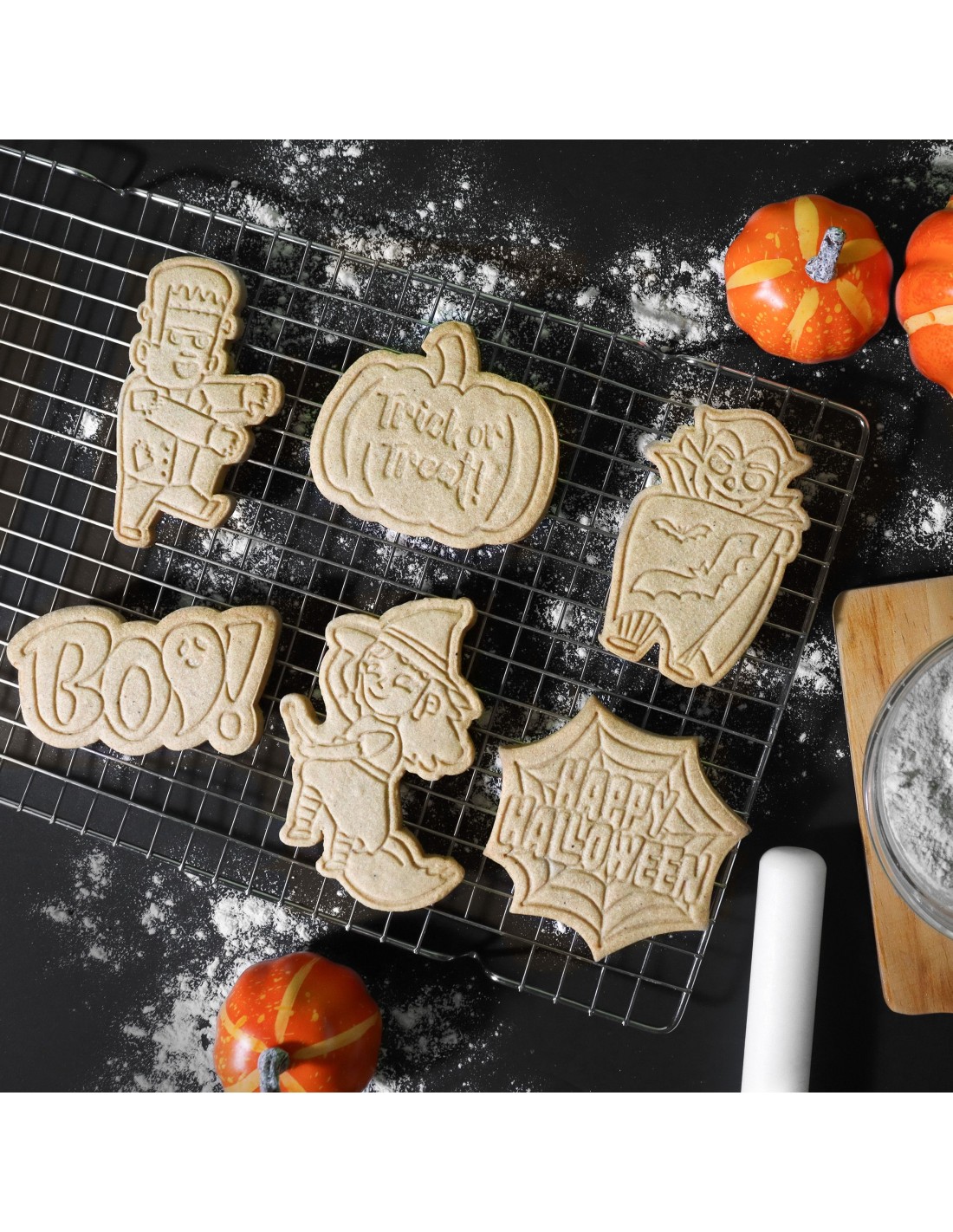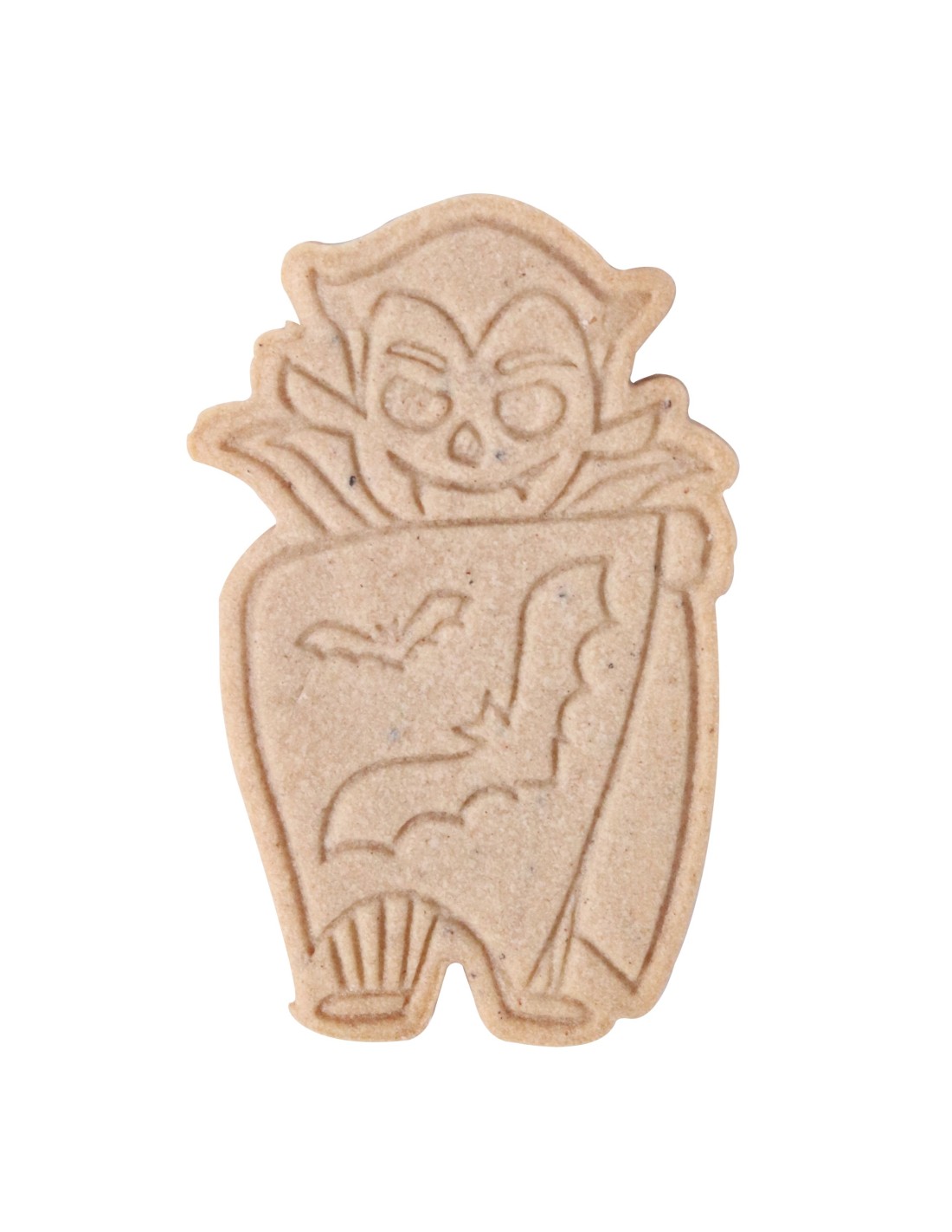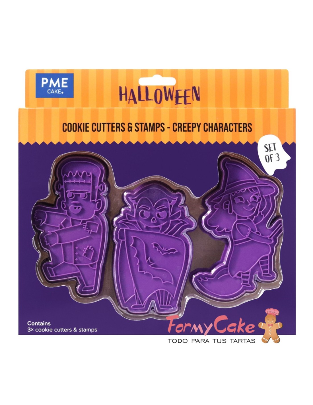 - El set incluye 3 cortadores + 3 grabadores hechos de plástico ABS seguro para alimentos. Dimensiones: Bruja (93 x 113mm), Vampiro (66 x 107mm), Zombi (64 x 114mm).