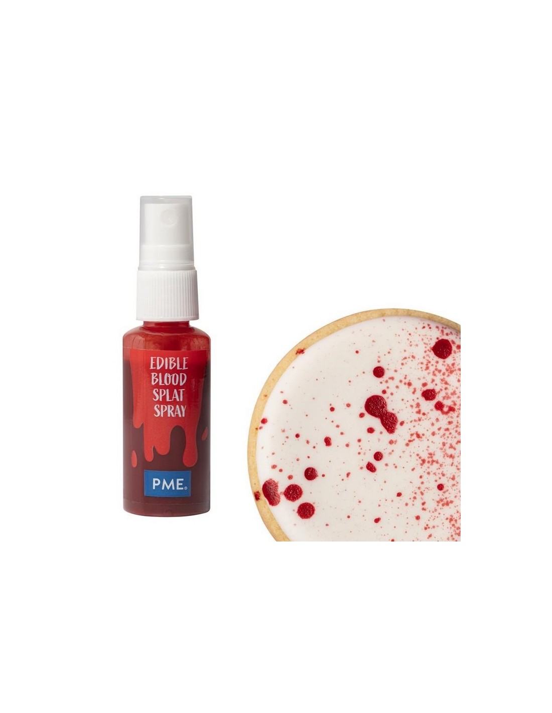 - El spray de salpicaduras de sangre de PME es el toque final perfecto para tus dulces más aterradores. ¡Con solo una pulverización, transforma tu tarta de Halloween en una deliciosa escena del crimen!