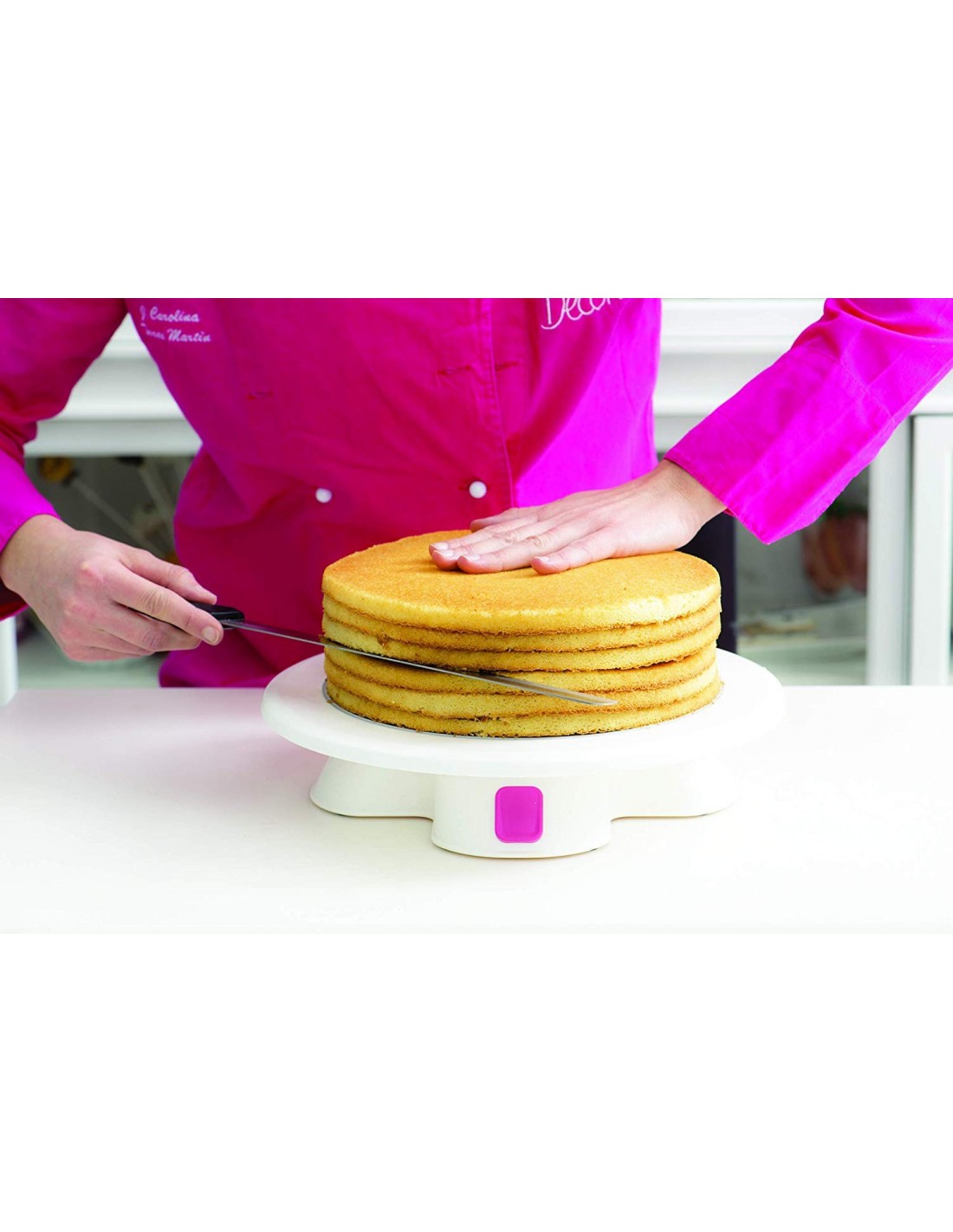 La base es giratoria horizontalmente y es apta para tartas de hasta 32 cm.
