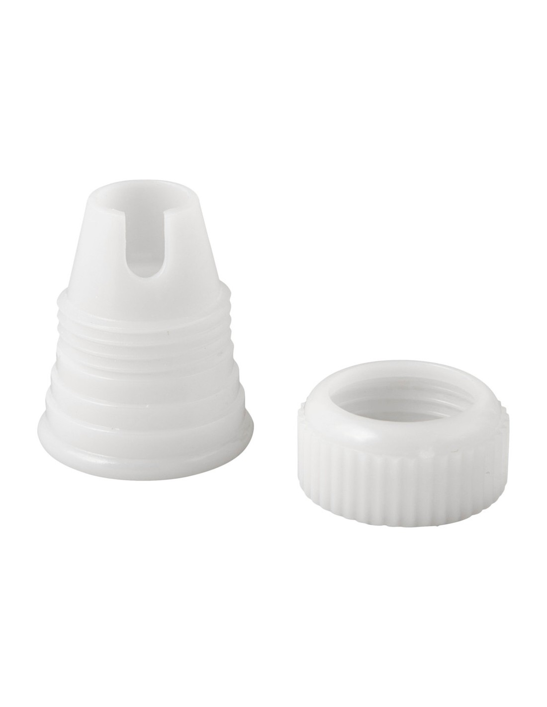 Modo de uso: Retira el aro de la base; coloca la base, primero el extremo estrecho, en la manga, presionando hasta el fondo; corta la manga por debajo de la rosca inferior; vuelve a colocar el acoplador en su lugar; usando el aro, fija la boquilla de manga pastelera estándar a la manga. Para cambiar las boquillas, desenrosca el aro y reemplázalo con una boquilla nueva.