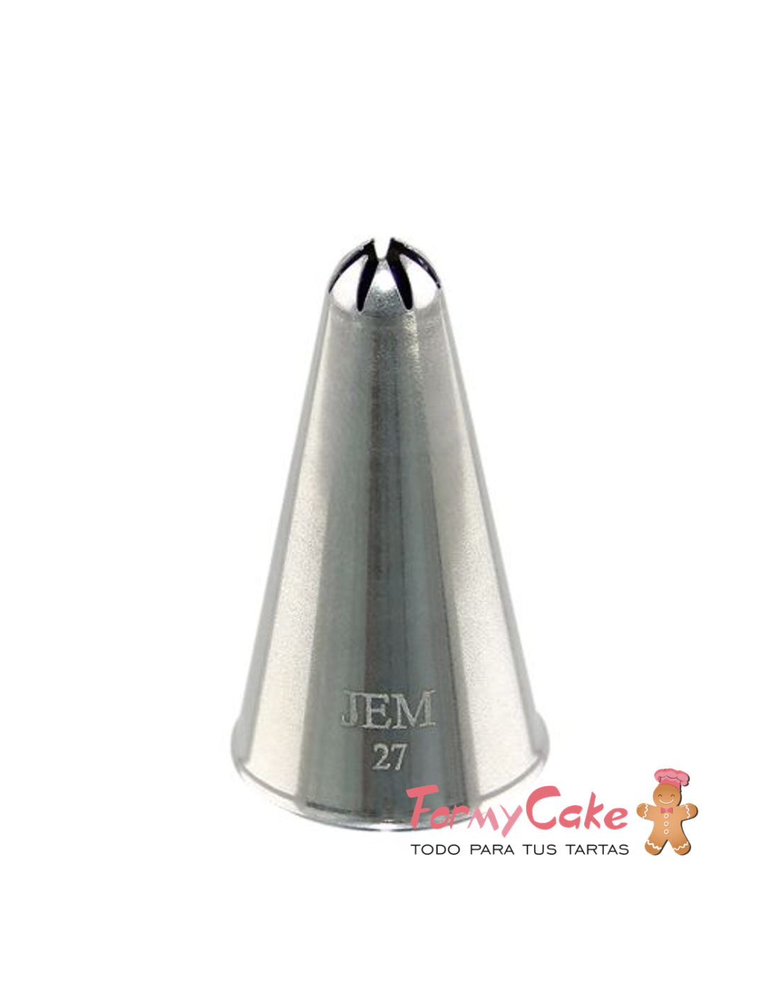 Boquilla de Estrella Cerrada JEM nº 27 Ideal para flores de gota, conchas, rosetas y estrellas estriadas Tamaño : Diámetro de la punta 6,5 mm Diámetro de la base 18 mm Altura 30,5 mm Nº de Puntos: 7 Todas las boquillas son aptas para utilizarlas con mangas desechables y de tela.