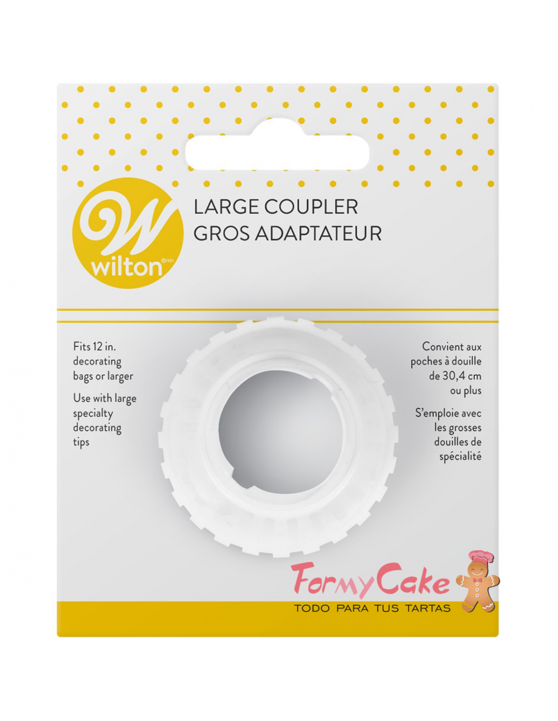 Este adaptador grande (Large Coupler) de Wilton es adecuado para casi todos las boquillas (duyas) grandes, pero también es universal, lo que significa que lo podrá utilizar con todas las demás marcas. Se suministra empaquetado por unidad, en un blíster (con tarjeta de identificación).