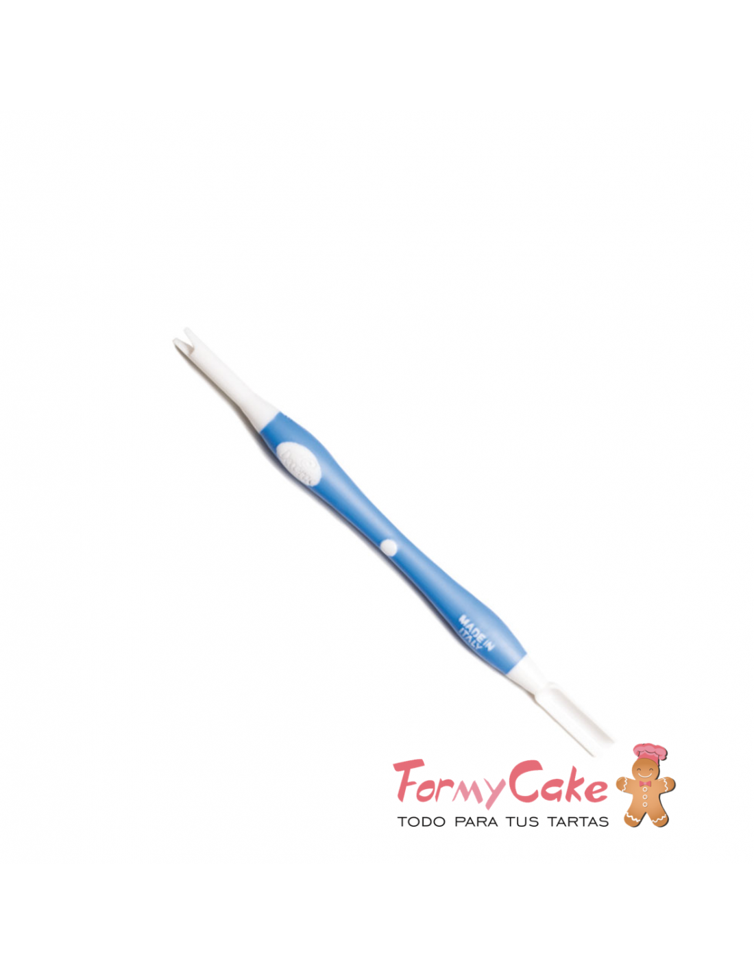 Herramienta de modelado realizada en un material de alta calidad con un semicírculo a un lado para, por ejemplo, crear bocas, ahuecar timbres o extraer círculos en trabajos decorativos. En el otro lado, un extremo con una cinta para crear bordes decorativos o pespuntes en, por ejemplo, un lazo o un vestidito de bebé.