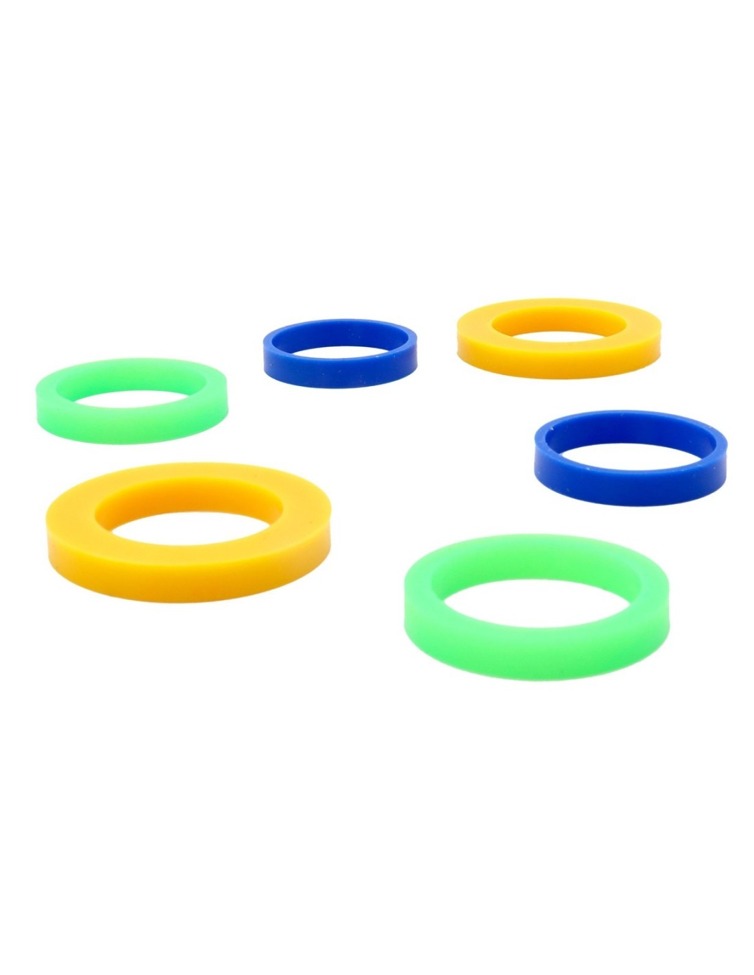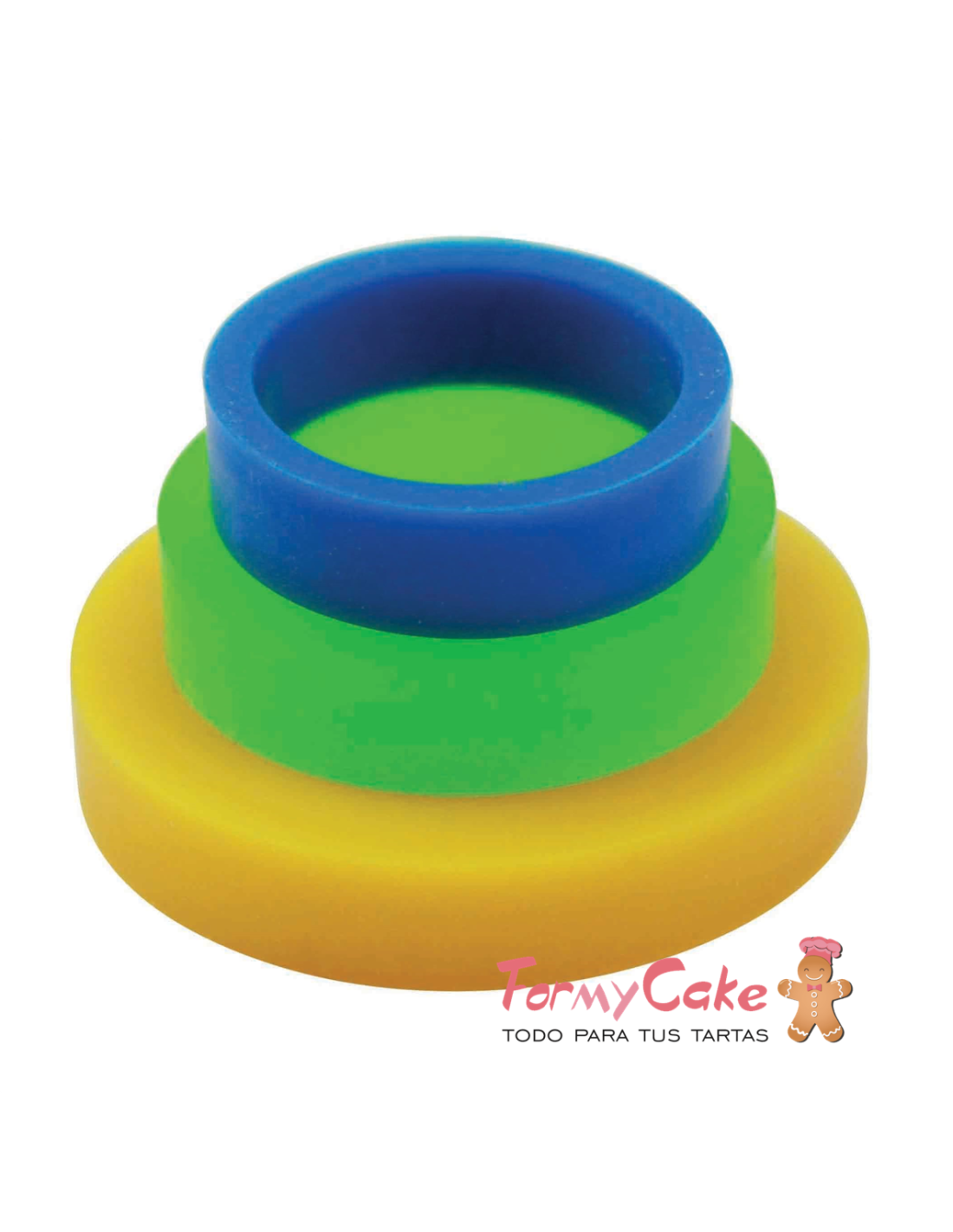 Incluye 3 tamaños diferentes. Altura de los anillos: Amarillo 7 mm, Verde 4 mm y Azul 2 mm.