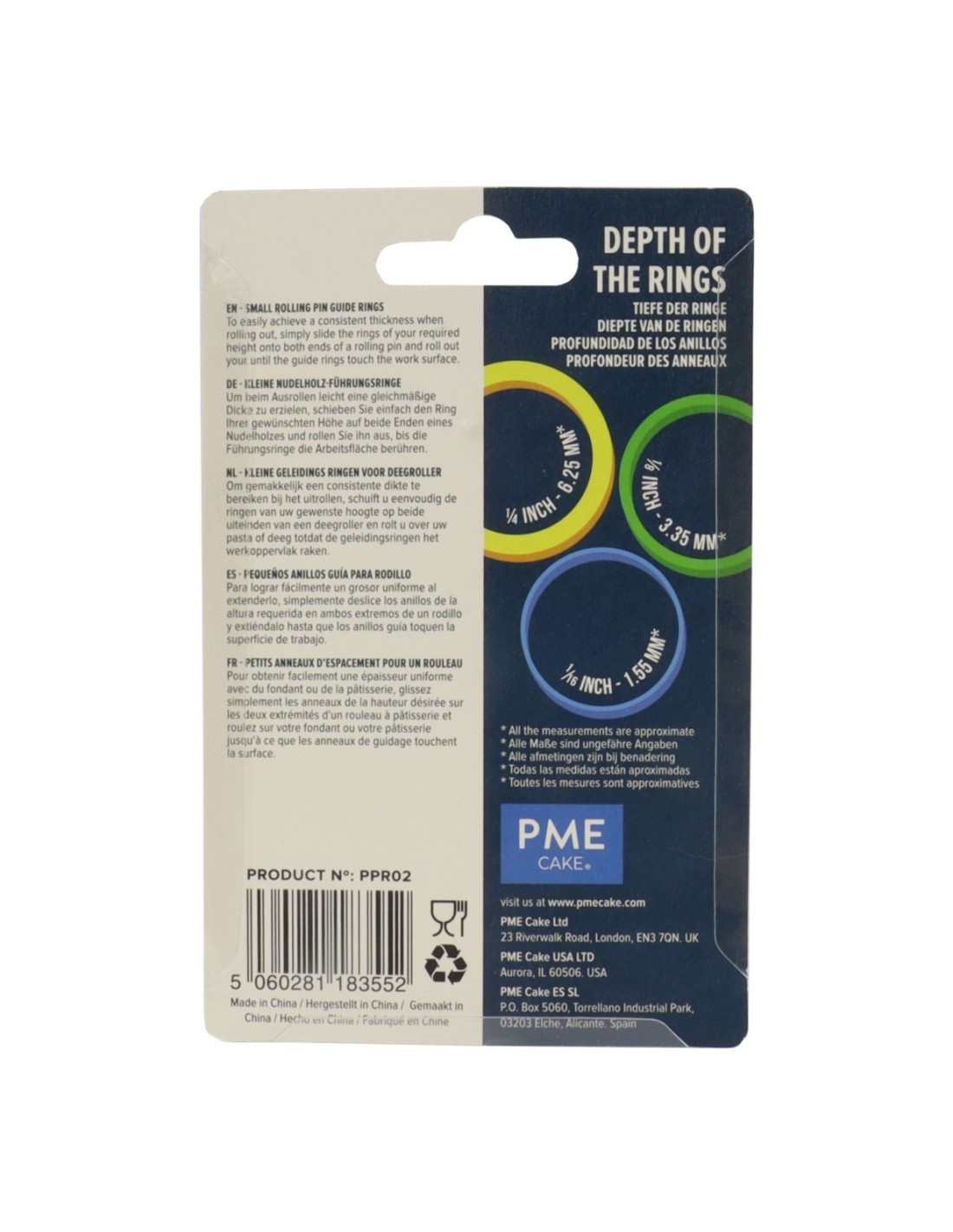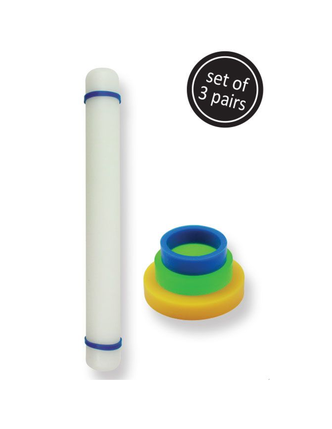 Prácticos anillos para rodillos de PME: La manera rápida y fácil de asegurar un grosor uniforme de la pasta o masa. ¿Cansada de que tus galletas salgan unas más grandes que otras? Si quieres obtener una masa con un grosor uniforme simplemente tienes que poner cada anillo del grosor deseado en los extremos del rodillo y extender la masa hasta que los anillos de guía toquen la superficie de trabajo. Ideal para usar con una amplia variedad de masas y pastas.