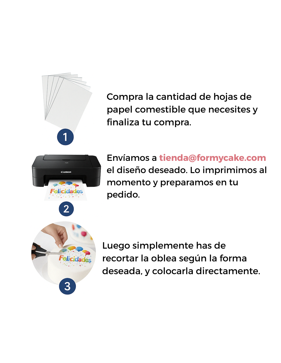 Compra las cantidades de papel comestible que necesites y una vez finalizada la compra envíanos tus archivos a: tienda@formycake.com, te lo imprimimos y enviamos a tu domicilio.