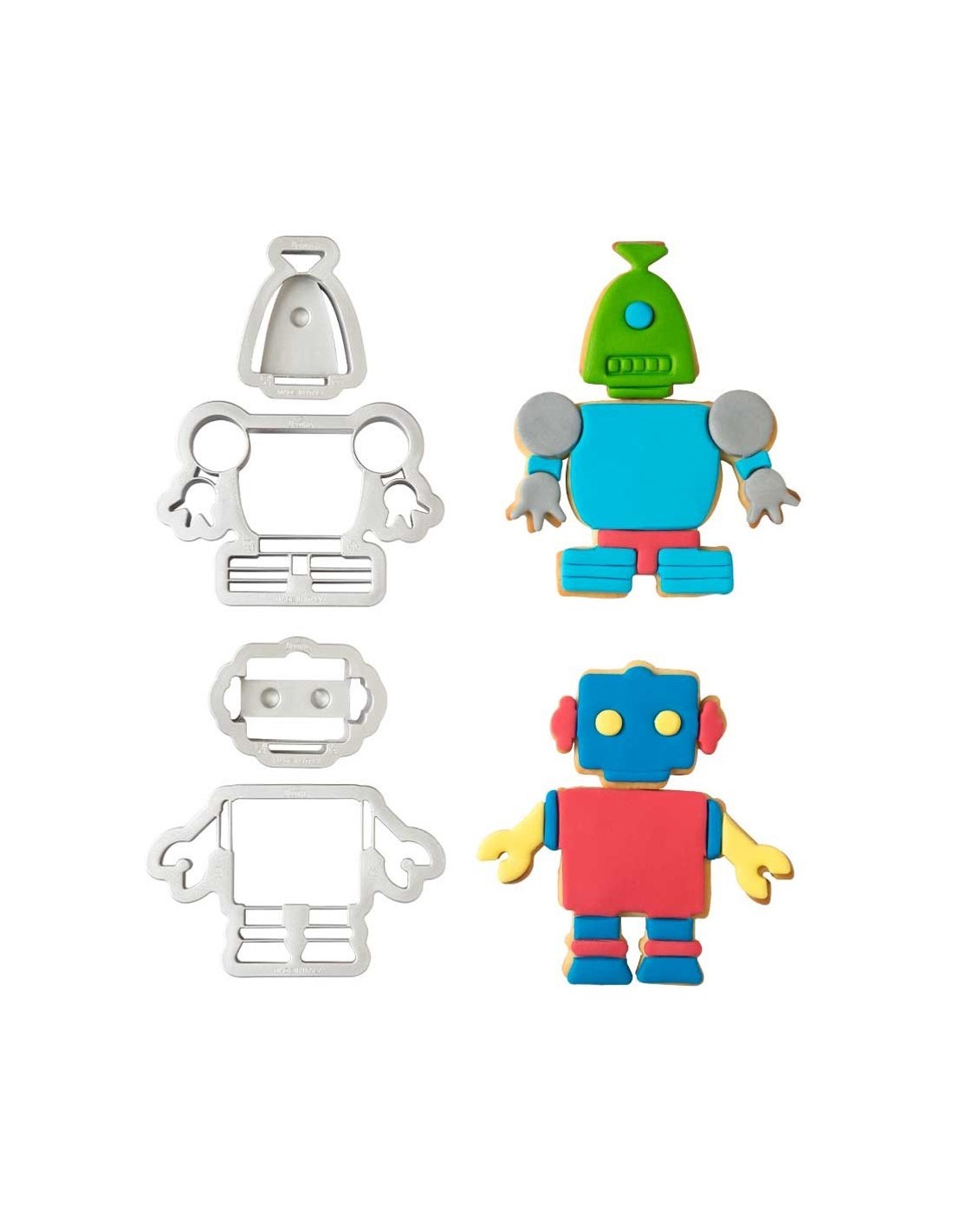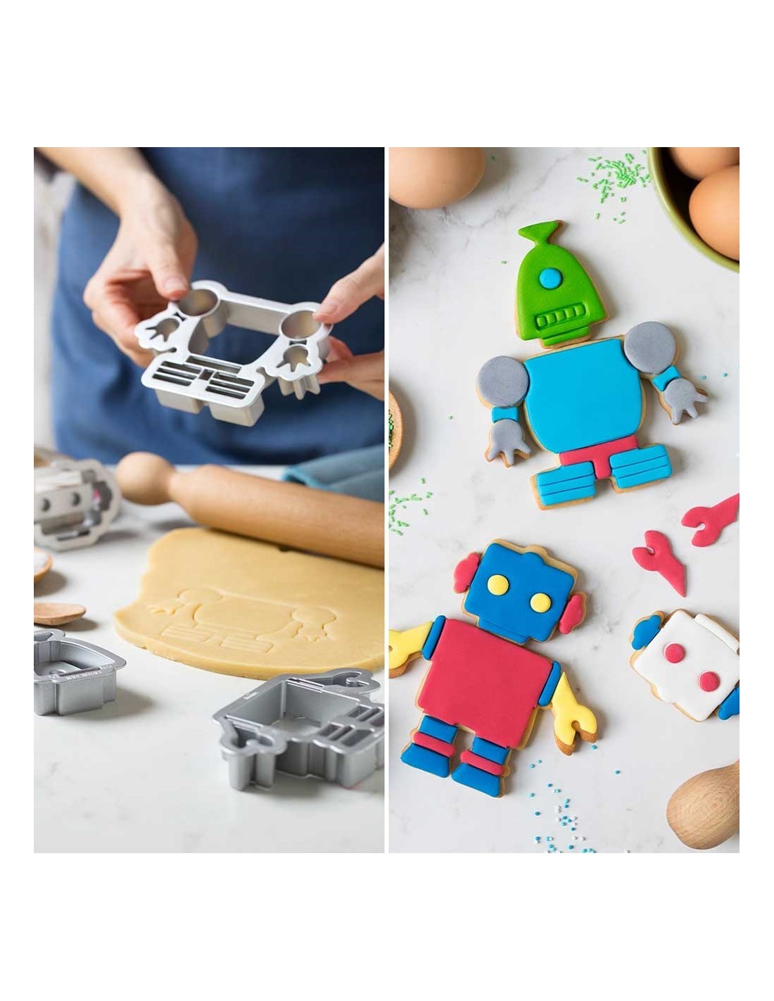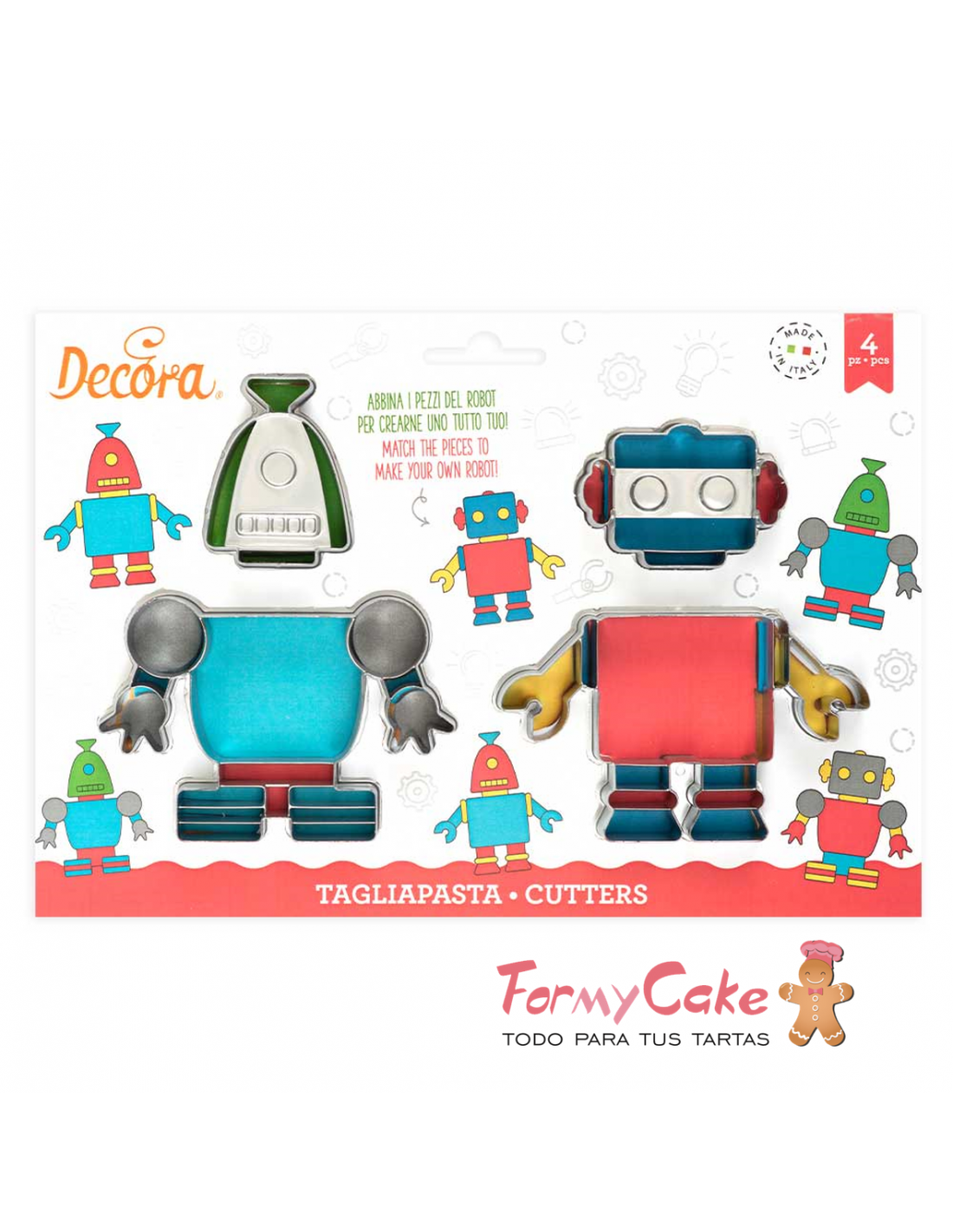 Juego de 4 cortadores de plástico; perfecto para la elaboración de bizcochos, formas y pastas dulces, saladas, de chocolate y para modelar. Combina los componentes y decóralos para crear tu robot muy original. ¡Combina las piezas del robot para hacer las tuyas!