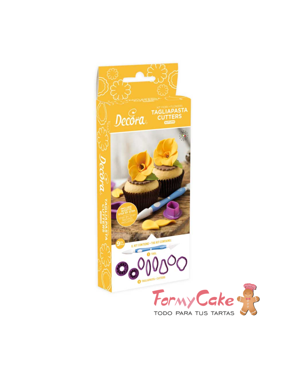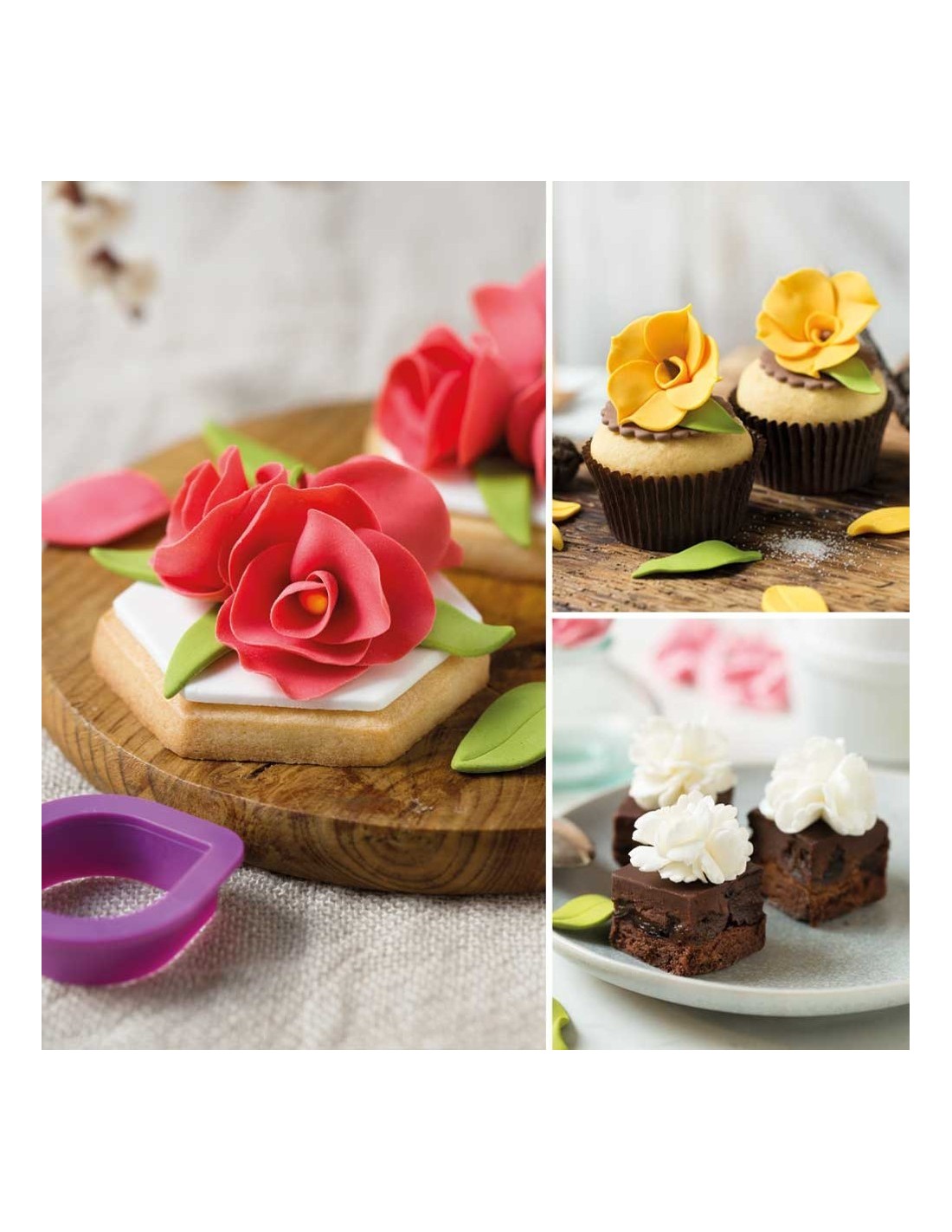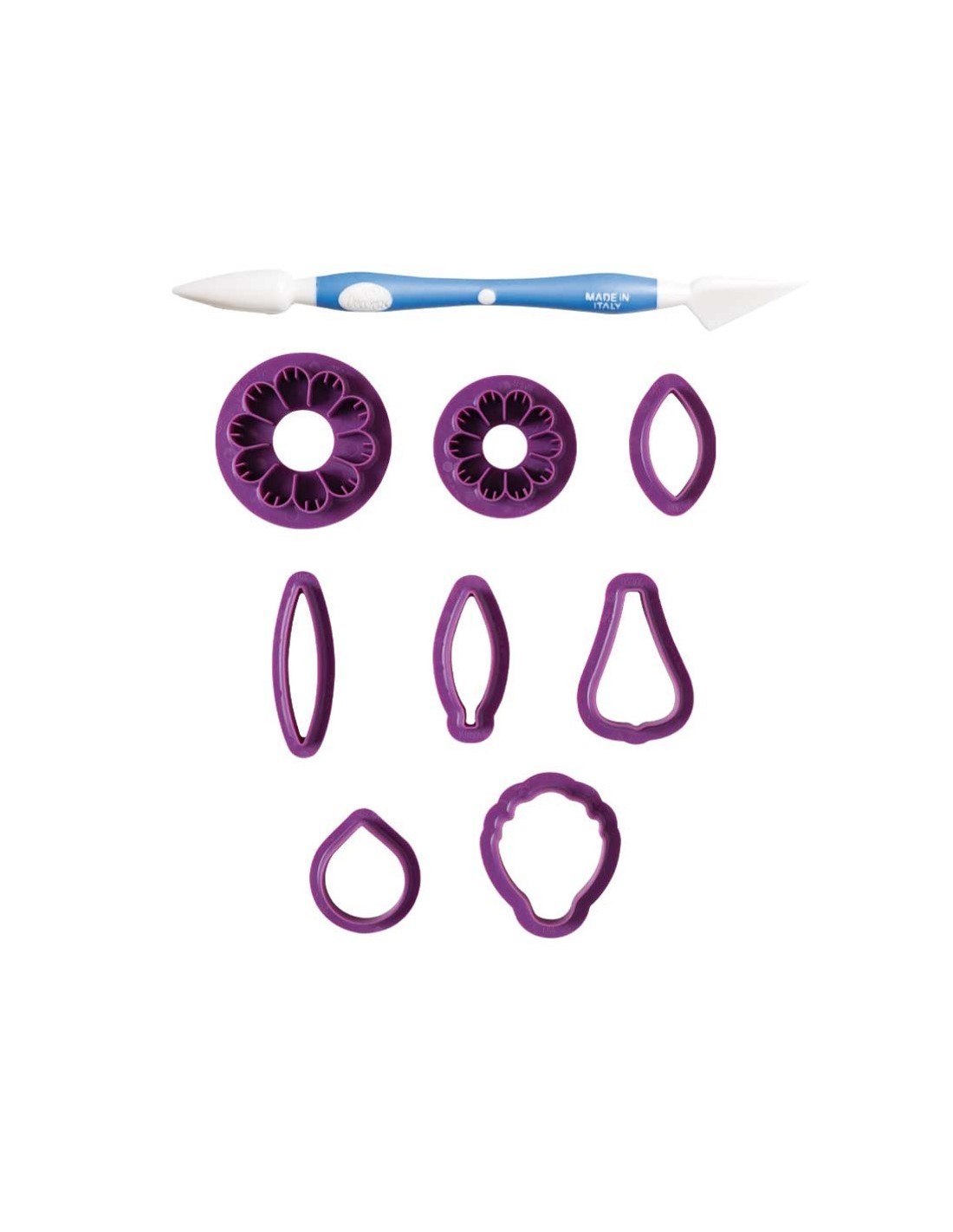 Un set de 8 cortadores de pastelería y 1 herramienta para un sinfín de creaciones. Decora pasteles, magdalenas y galletas con el kit cortador de masa y la herramienta para crear flores y decoraciones de pasta de modelar. Siga los consejos del folleto incluido en el kit para facilitar su uso. Ideal para hacer flores como Alstroemeria, Granada, Clavel, Anémona y muchas otras.