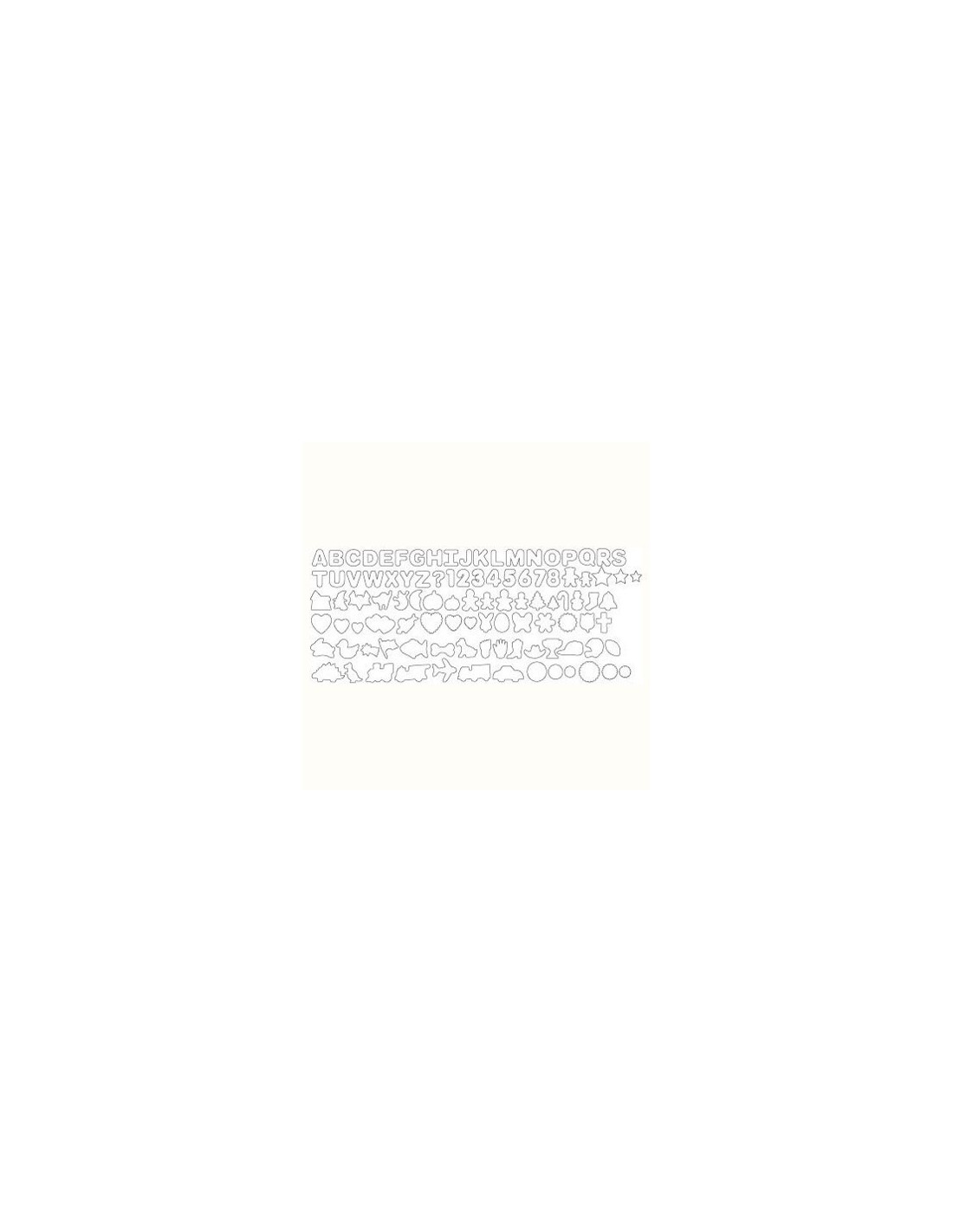 El set contiene las letras, de la A a la Z, interrogación, números 1-8, corazones en diversos tamaños, 3 medidas diferentes de corazones partidos, doble corazón, corazón con flecha, cara de conejo, huevo, mariposa, flor, sol, tulipán, cruz, conejo, 2 medidas diferentes de calabazas, fantasma, hombre, gato asustado, casa de fantasmas, bruja, murciélago, 2 formatos de muñecos de galleta y chica de galleta, 2 medidas de árbol de Navidad, golosinas, muñeco de nieve, almacén, campana, pie, mano, bota, sombrero de vaquero, estrella de Belén, bandera, 3 medidas de círculo, 3 medidas de estrella, 3 medidas diferentes de círculo esculpido, hueso, perro, pez, 2 diferentes medidas de osito de peluche, patito, estegosaurus, Tiranosaurus Rex, copa de trofeo, gorra de béisbol, casco de rugby, fútbol, tren, coche, avión, camión de bomberos y volquete.