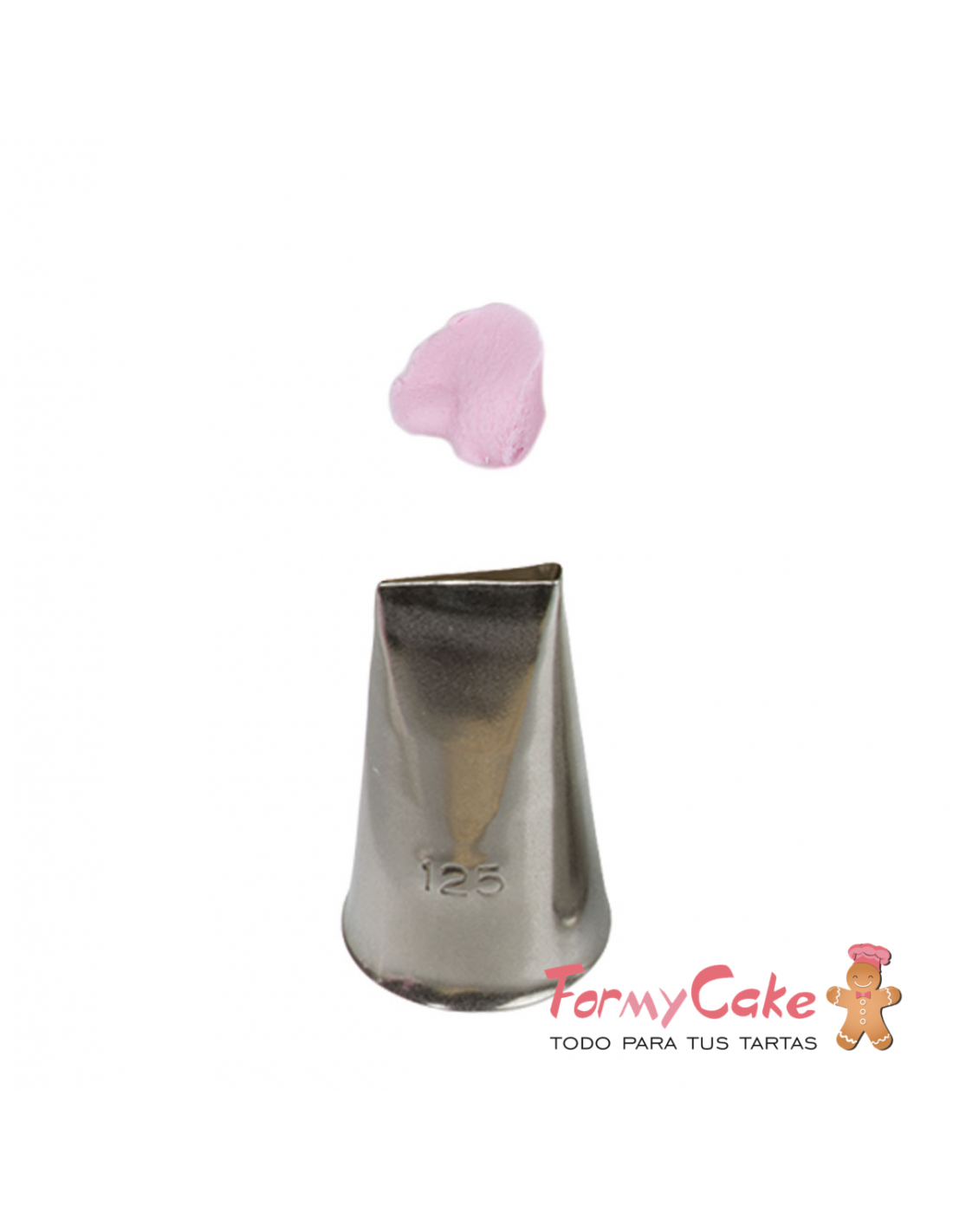 Boquilla de metal (decorating tip) para la elaboración de pétalos, arcos, drapeados, etc. Se suministra empaquetado por unidad, en un blíster (con tarjeta de identificación).