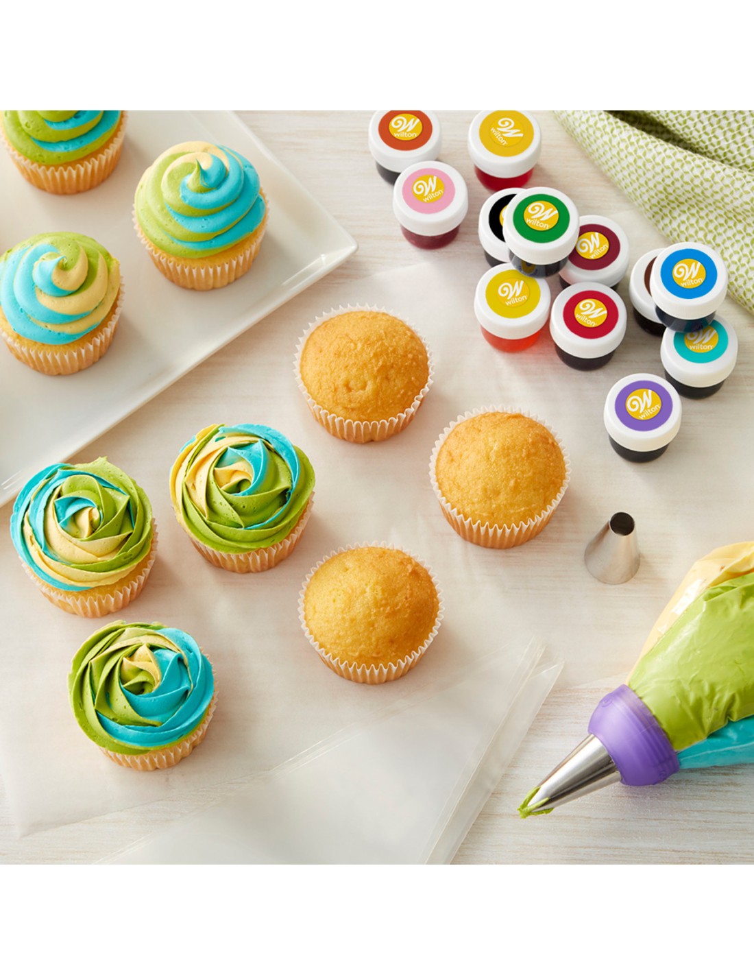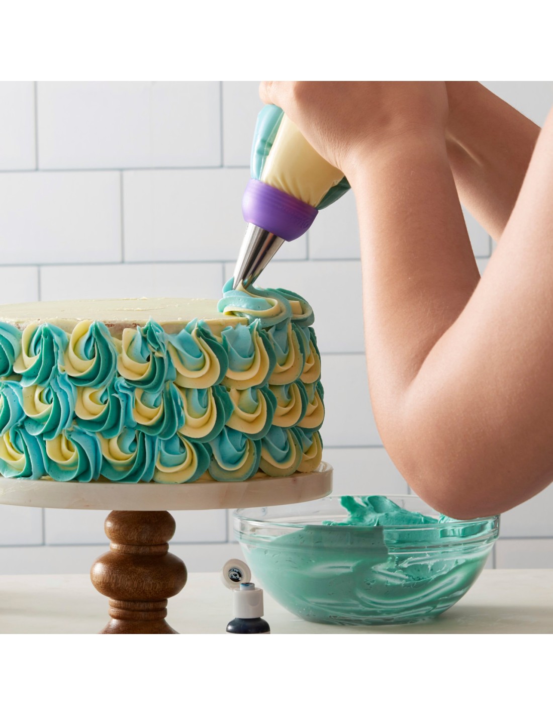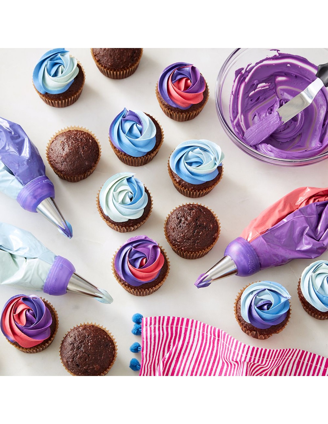 Decora de manera fácil con buttercream de varios colores de una sola vez, gracias al Adaptador Tricolor Grande ColorSwirl de Wilton. Este adaptador te permite realizar coloridos diseños con buttercream con sólo un movimiento.