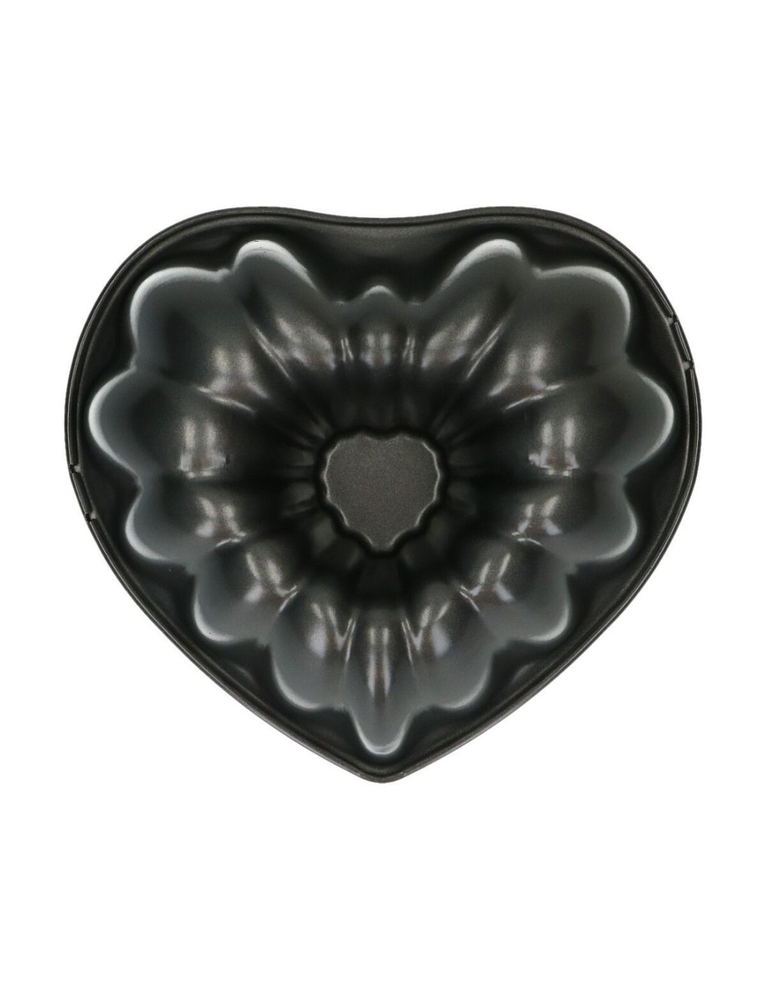 Molde metálico para bundt con forma de corazón acanalado.