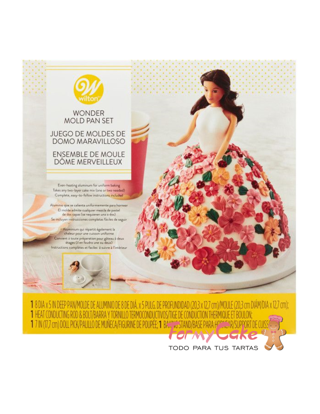 Con este fantástico molde puede crear una elegante forma en 3D para diseñar fantásticos vestidos. Para utilizar con los pin pops de Wilton (muñecas). El molde tiene 20 cm de diámetro y 12,5 de profundidad. El set consta de un molde, distribuidor del calor, pinpop (muñeca morena) y manual de instrucciones en inglés. Es de aluminio.