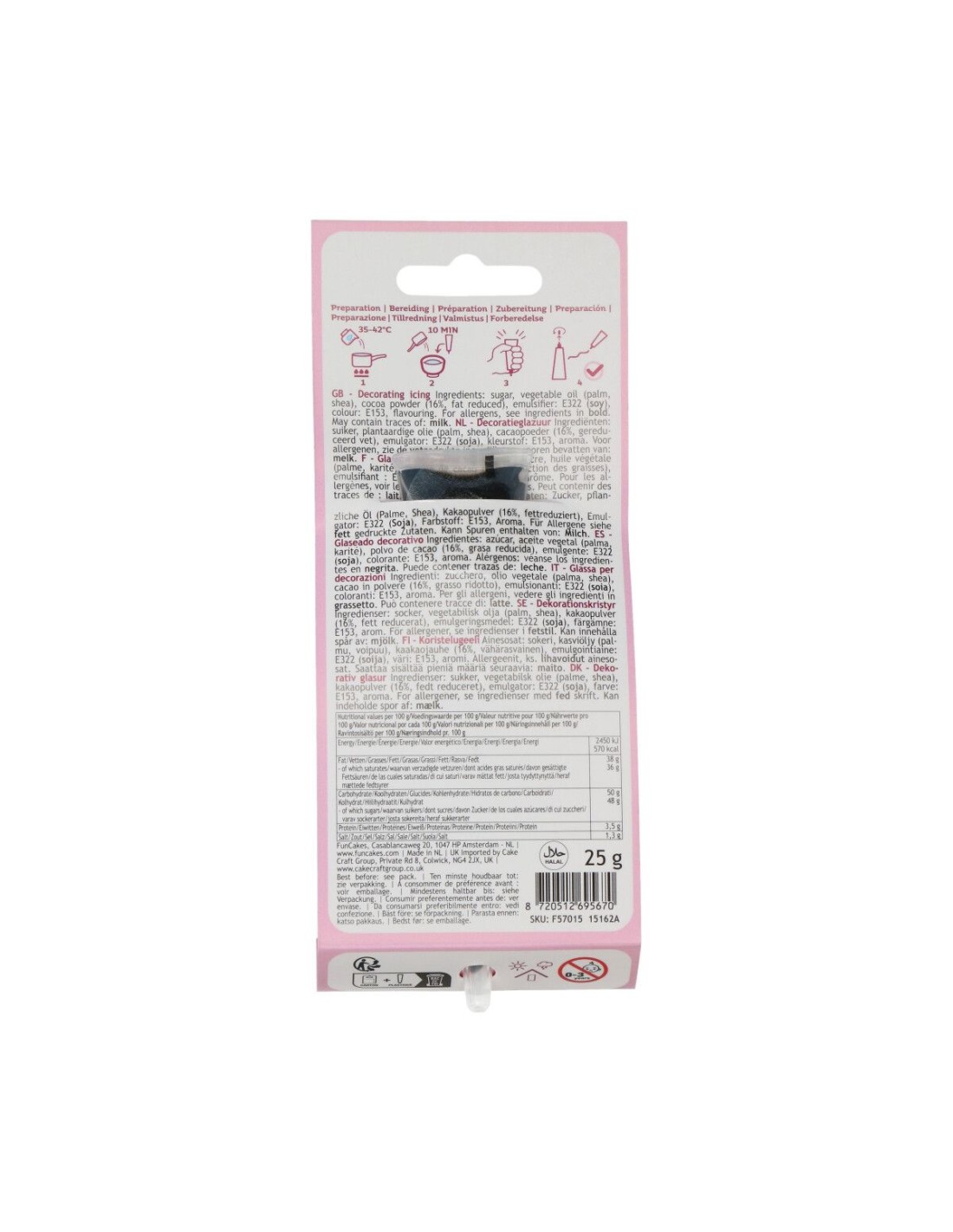 Ingredientes: azúcar, aceite vegetal (palma, karité), polvo de cacao (16%) (grasa reducida), emulgente: E322 (soja), colorante: E153, aroma.