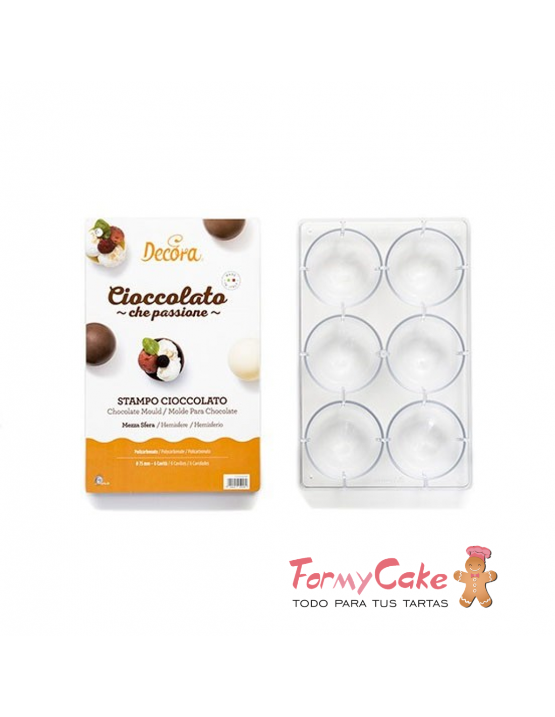 Molde para semiesferas de chocolate. Este molde contiene 6 cavidades de 75 mm para realizar fantásticas semiesferas huecas y luego poderlos decorar o rellenar con fondant o glasa.