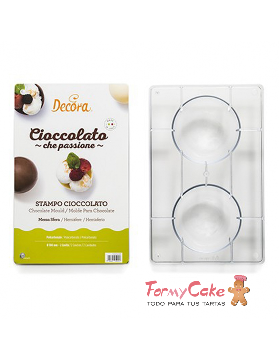 Molde para semiesferas de chocolate. Este molde contiene 2 cavidades de 100 mm para realizar fantásticas semiesferas huecas de chocolate y luego poderlos decorar con fondant o glasa. Molde de policarbonato de excelente calidad de Decora.