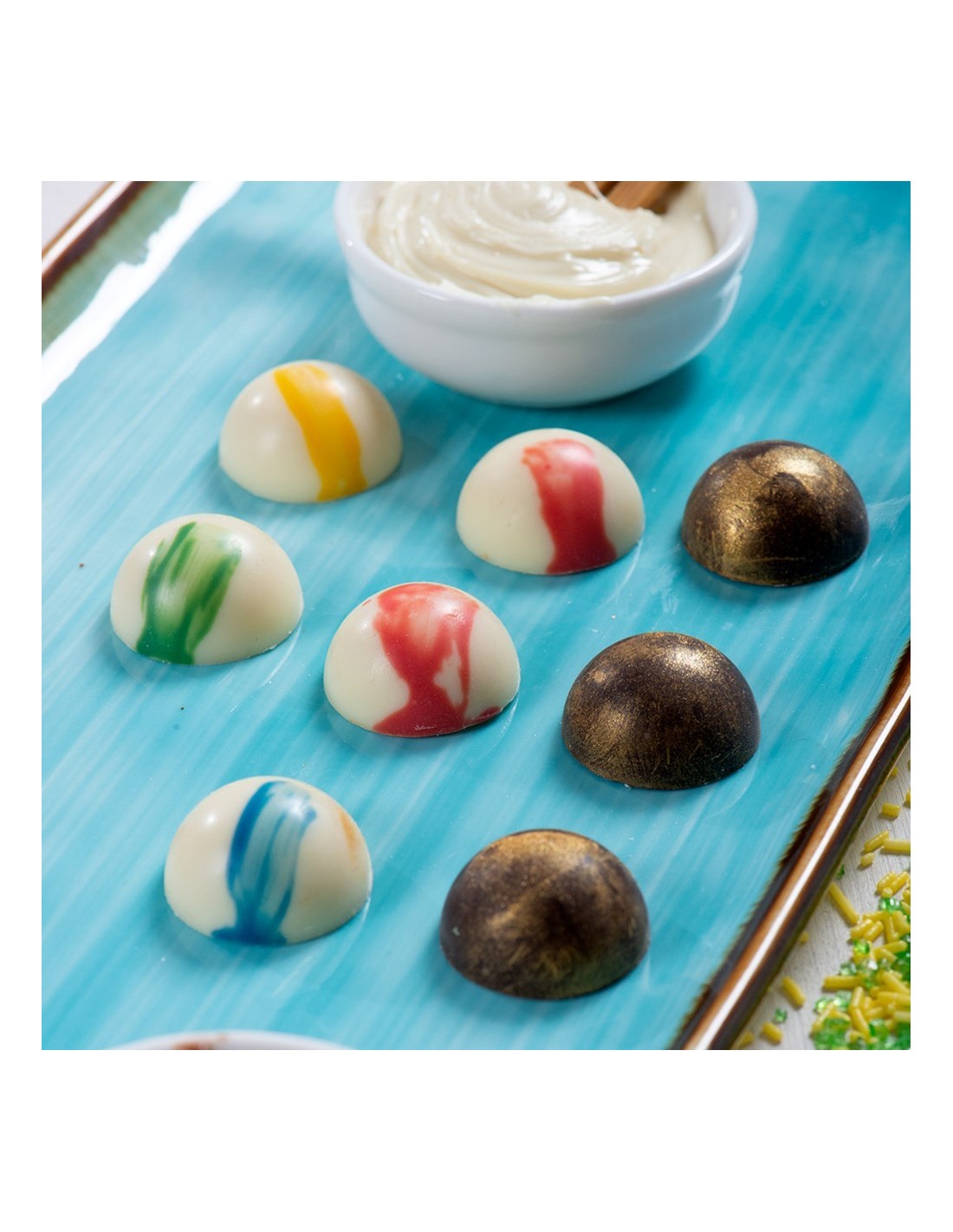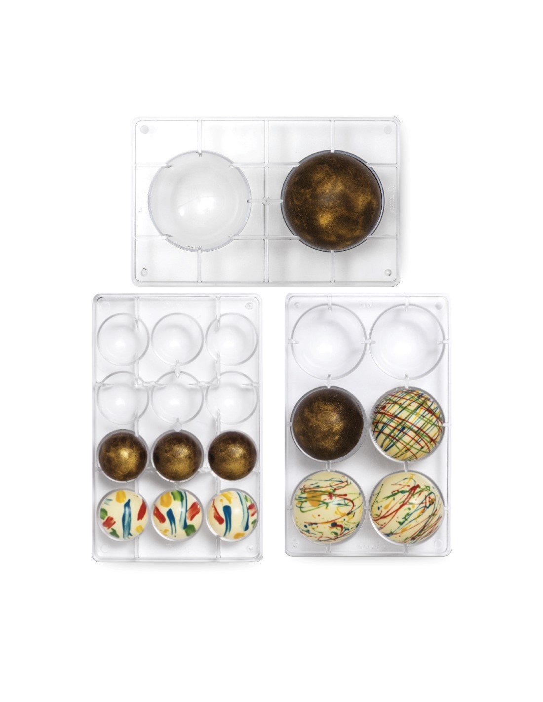 Moldes profesionales en policarbonato, un material que permite obtener chocolates brillantes y perfectos. Es importante templar bien el chocolate antes de verterlo en el molde.
