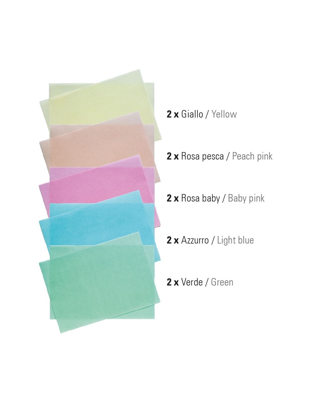 Paquete de 10 piezas. 2 hojas por color: rosa, amarillo, melocotón, azul claro, verde.