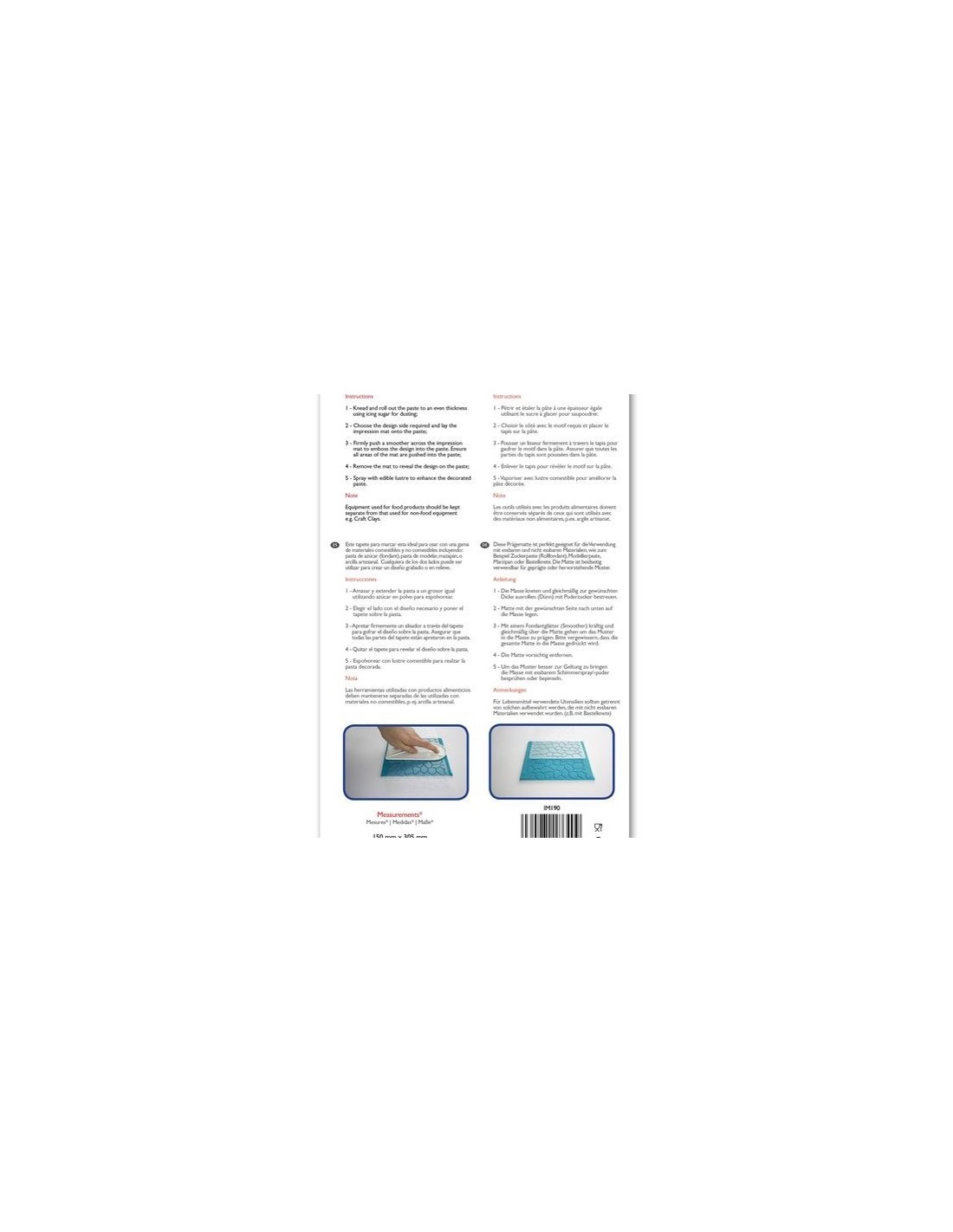 El tapete para impresión de PME te soluciona de una manera sencilla un diseño de camino de piedras, o de muro natural en cualquier pasta. Este tapete de impresión es ideal para su uso con una amplia gama de materiales comestibles incluyendo: pasta de azúcar (fondant), pasta de modelar (pasta de goma) o el mazapán. Se consigue una impresión con figuras de remolino muy bonitas y se pueden utilizar para un montón de tartas o cupcakes diferentes. Además ambas caras se pueden utilizar para conseguir diseños diferentes. Modo de empleo: