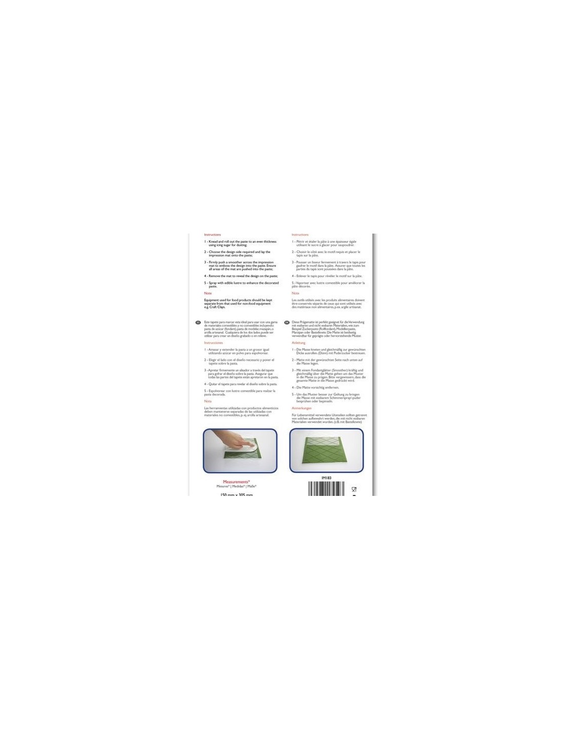 Instrucciones de uso: Amasar y extender la pasta al grosor deseado. Es recomendable engrasar el tapete con un poco de manteca vegetal Crisco o espolvorearlo con azúcar en polvo. Elegir el lado con el diseño deseado y poner el tapete sobre la pasta de azúcar. Apretar firmemente con una paleta alisadora a través del fondant para marcar el diseño sobre la pasta de azúcar.