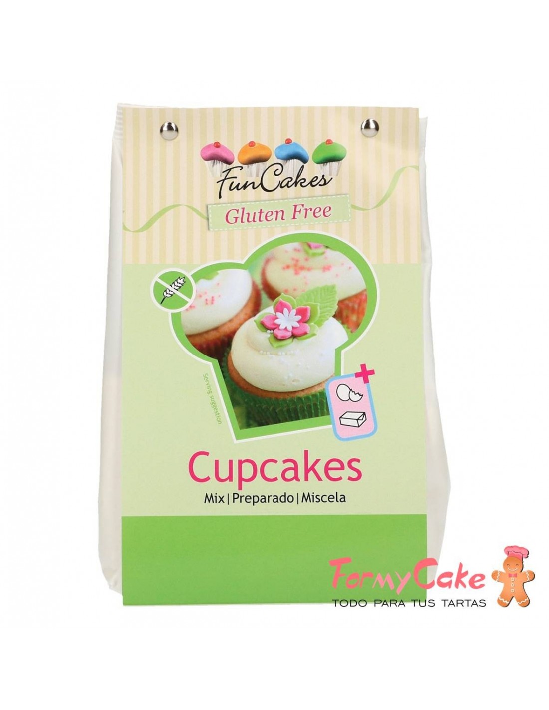 Prepara deliciosos cupcakes sin gluten con este preparado de FunCakes! Los cupcakes tienen un sabor riquísimo y se pueden decorar, una vez horneados, con crema de mantequilla, con fondant de almendras o con fondant normal.
