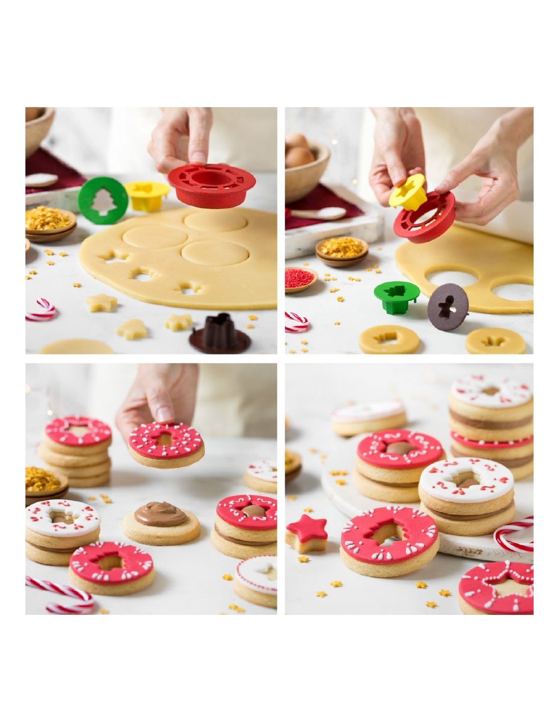 Juego de 4 cortadores de plástico; perfecto para hacer galletas y pastas dulces, saladas, de chocolate y para modelar. La clásica galleta de "ojo de buey" se renueva y se vuelve más