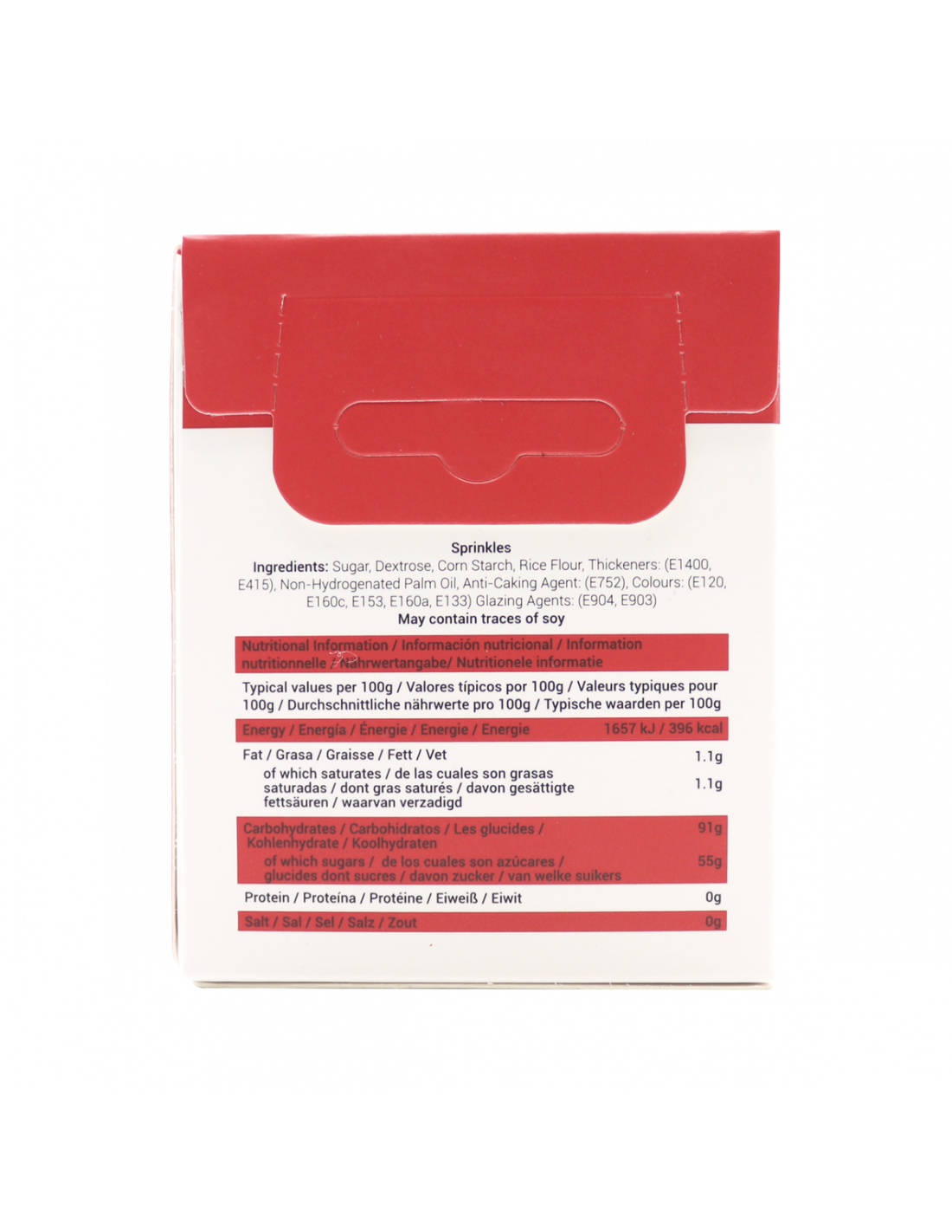 Ingredientes: Azúcar, dextrosa, almidón de maíz, harina de arroz, espesantes: (dextrina, E415), aceite de palma no hidrogenado, antiaglomerante: (E470b), colorantes: (E120, 160c, 153, E160a, E133), agentes de recubrimiento: (E904, E903)