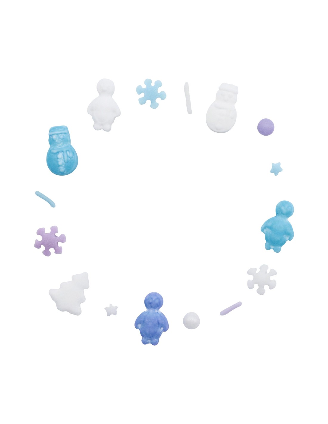 - 60g de sprinkles en una mezcla festiva de árboles, pingüinos, muñecos de nieve, perlas y más, con un tema en azul, morado y blanco.