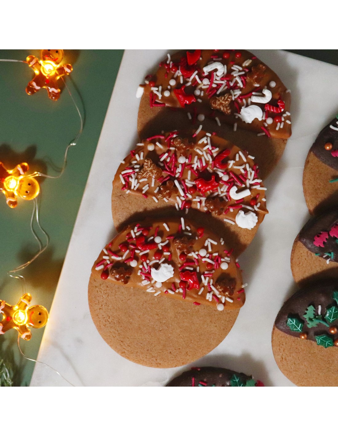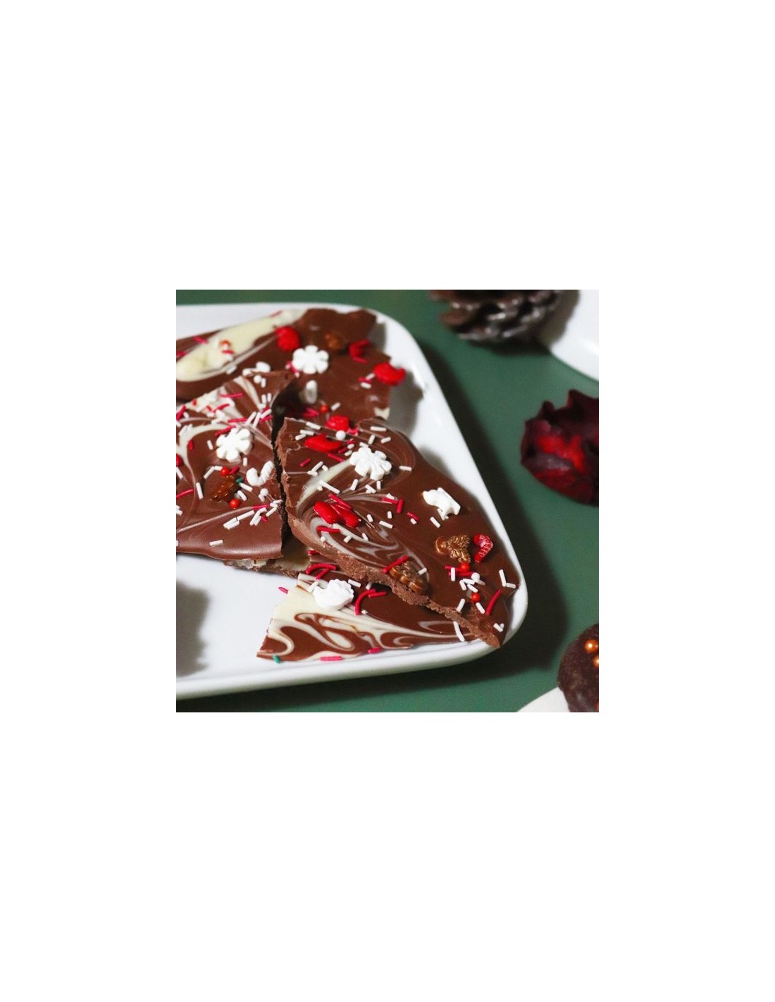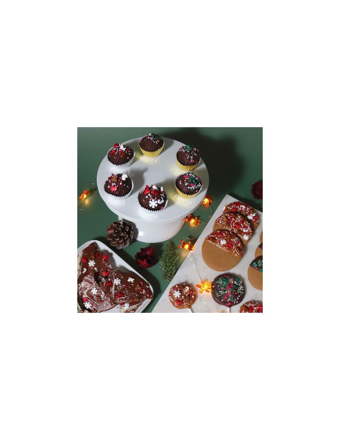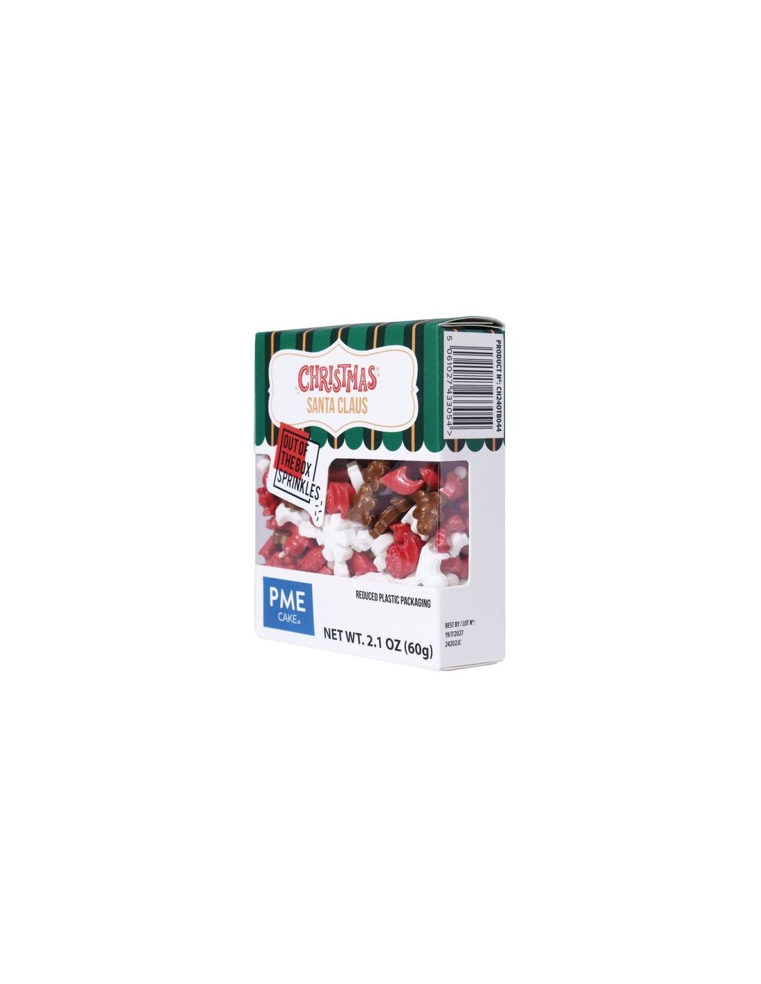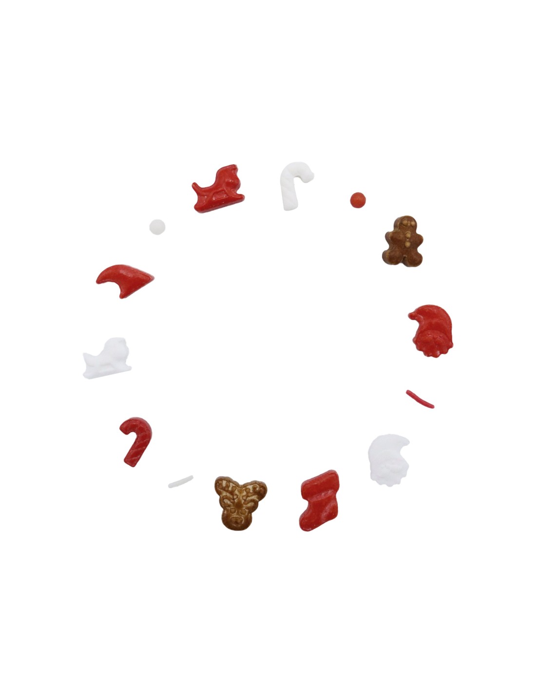 - 60g de sprinkles en una mezcla festiva de Papá Noel, trineos, renos,grageas y más, con un tema en rojo y blanco.