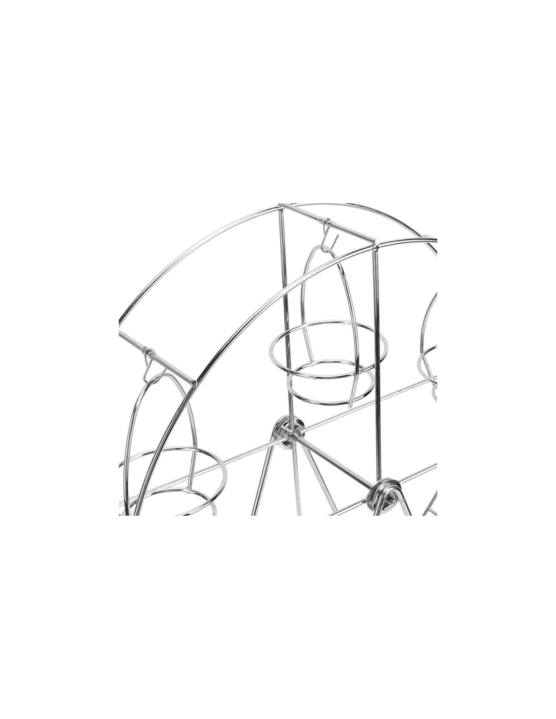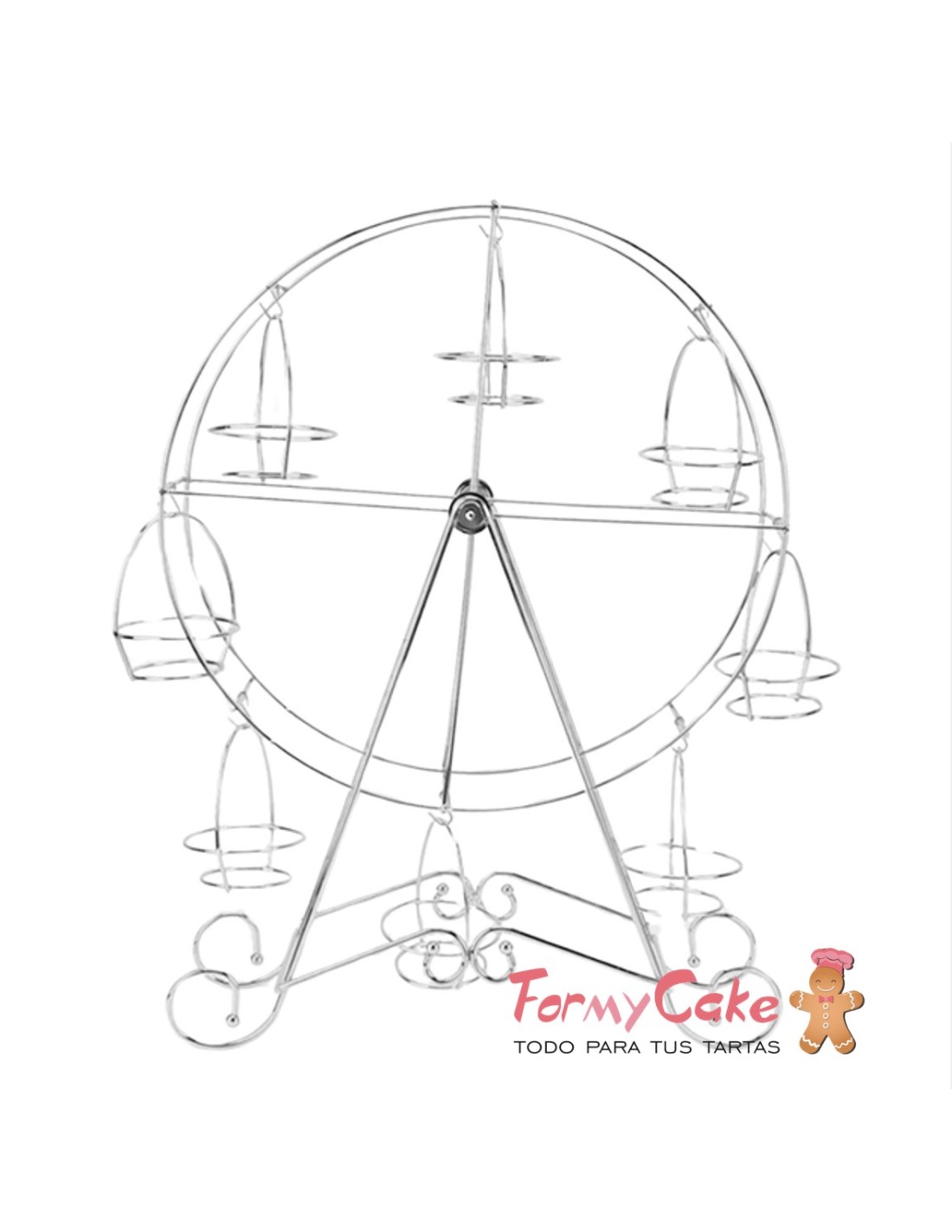 Soporte metálico giratorio con original diseño de noria, elegante y funcional, con capacidad para 8 magdalenas. Perfecto para añadir un toque dinámico a cualquier celebración.