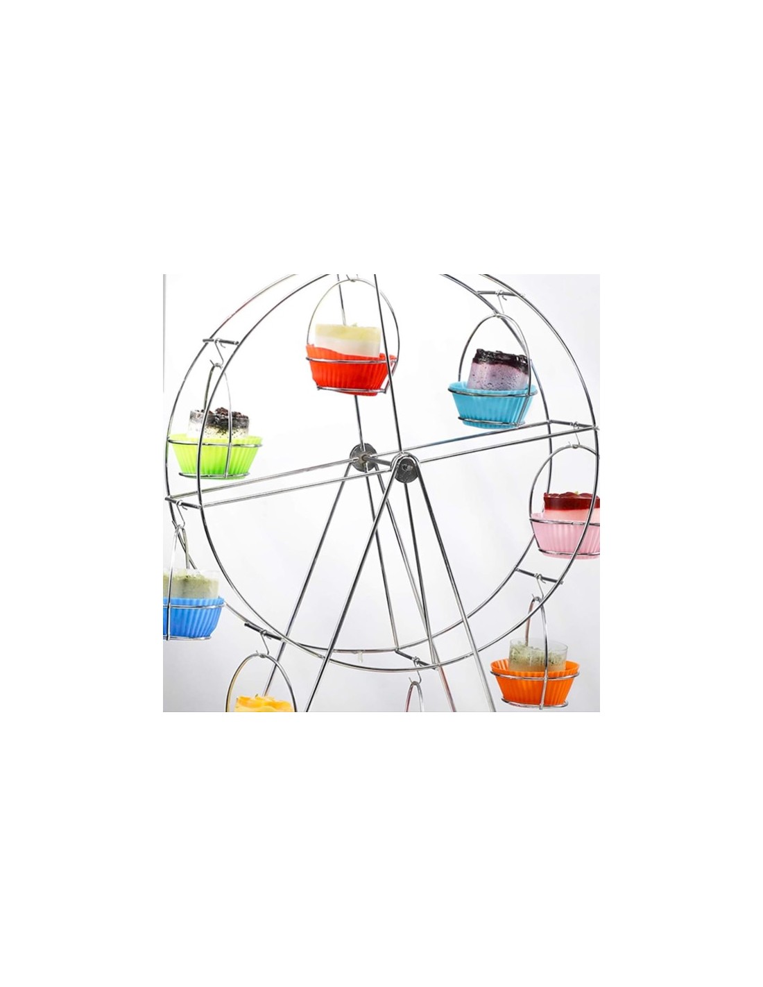 Con un hermoso acabado en color plateado, su diseño en forma de noria no solo atrae las miradas, sino que también permite que cada uno de tus 8 cupcakes se destaque en las cestas giratorias. Dale un plus a tu presentación de cupcakes y convierte tu mesa en el centro de atención. ¡No dejes pasar la oportunidad de deslumbrar a tus invitados con esta pieza única!