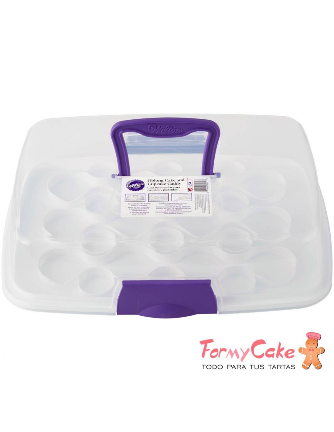 Práctico transportador rectangular de Wilton (Oblong Caddy with Reversible Base). No solo es perfecta para transportar tus tartas rectangulares, también es ideal para llevar tus cupcakes, muffins y mucho más. Tiene una base reversible para poder llevar 12 cupcakes o 24 mini cupcakes.