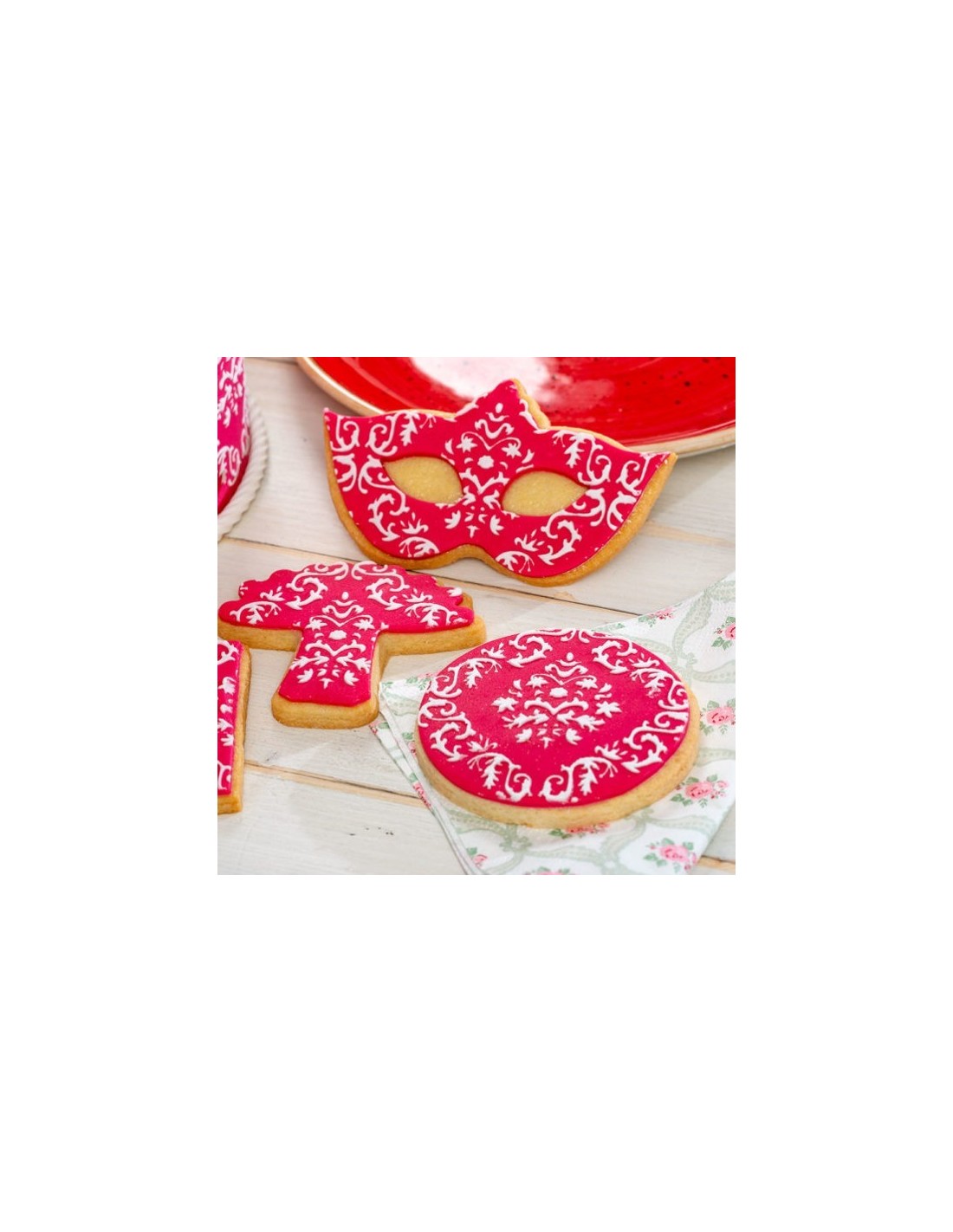 Stencil para la decoración de tartas con formas de damasco. Es flexible y se utiliza como plantilla. Se coloca en el lateral de la tarta y ahí se aplica un colorante en polvo, spray o glasa para que se queden las formas de figuras de damasco sobre la tarta. Si la tarta es de fondant el resultado es genial.