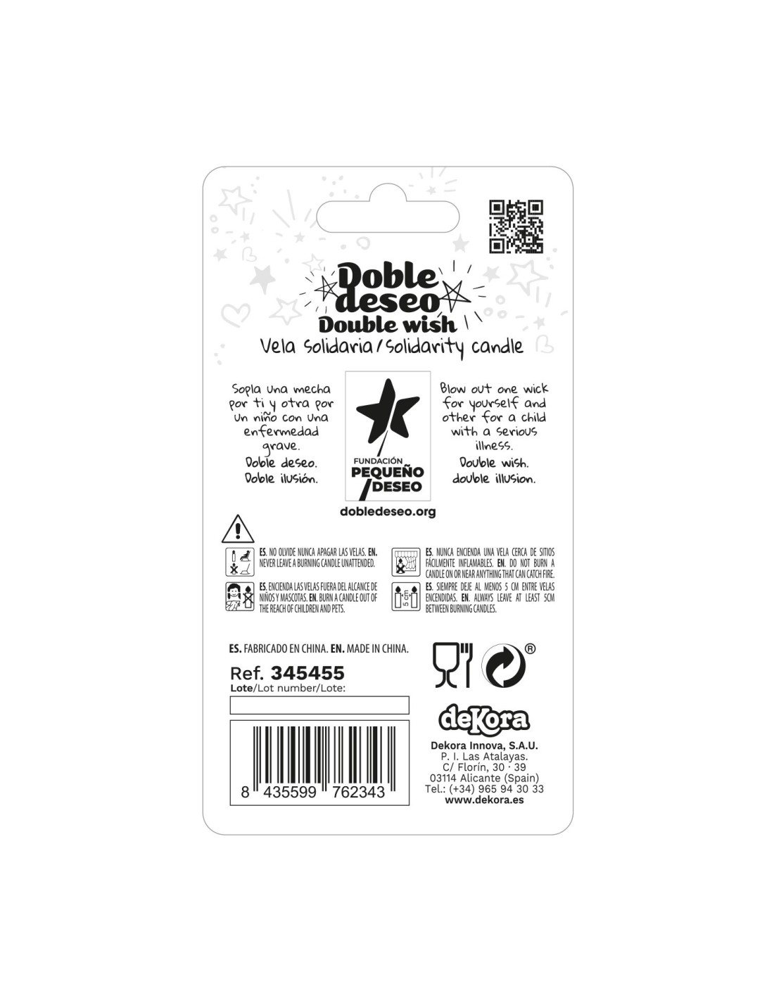 Velas solidorias Doble Deseo en forma de estrella con número con dos mechas para que pidas dos deseos. Estas velas colaboran con la Fundación Pequeño Deseo que trabaja para mejorar el estado anímico de niños con enfermedades graves a través del cumplimiento de sus deseos, con el objetivo de ayudarles a afrontar con más fuerza su tratamiento.