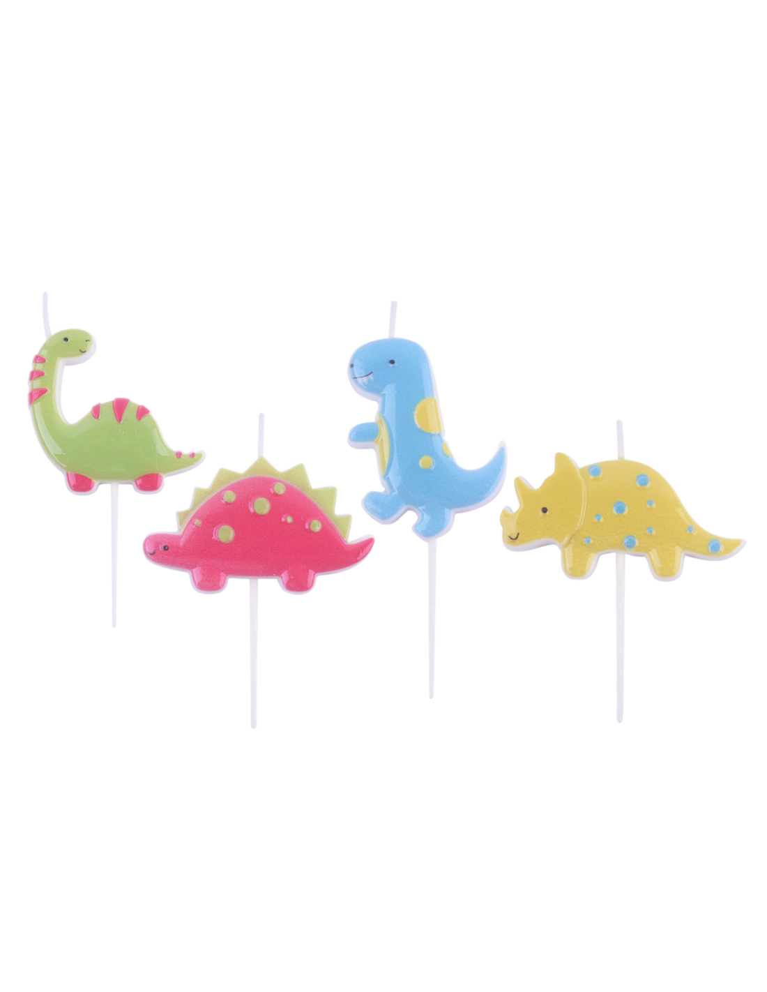 El pack incluye 4 velas, que tiene 4 dinosaurios diferentes T-Rex, Triceratops, Stegosaurus, Apatosaurus
