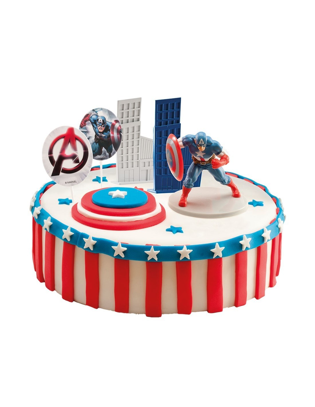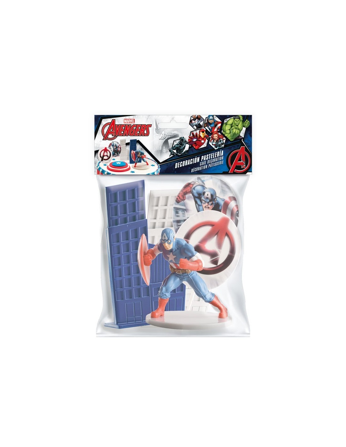 Kit de decoración de ''Los vengadores'' compuesto por una figura de Capitán América, 2 pinchos y 2 edificios decorativos.