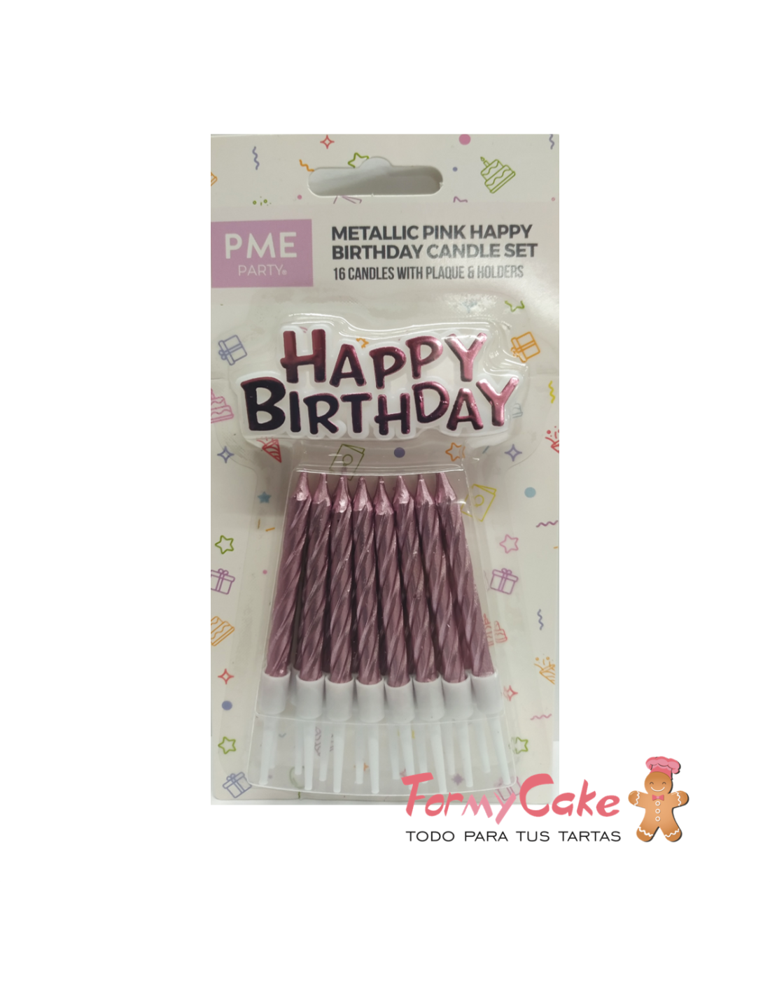 Este set de velas rosas de PME (Candles & Happy Birthday pink) son perfectas para añadir un toque especial a tus tartas de cumpleaños. El set contiene además de una vela con la palabra Happy Birthday, unas velas rectas.